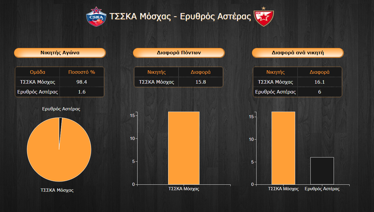 - Η ΤΣΣΚΑ Μόσχας υπερτερεί στις περισσότερες στατιστικές κατηγορίες των Σέρβων με τη διαφορά να είναι εμφανής τόσο σε ranking (102 έναντι 78,9) όσο και σε επιθετική και αμυντική λειτουργία με 89,4 πόντους για την ΤΣΣΚΑ και 77,7 κατά μέσο όρο για την ομάδα του Alimpijevic. Το παθητικό των Σέρβων επίσης είναι χειρότερο με 83,6 πόντους ανά αγώνα σε αντίθεση με αυτό των Μοσχοβιτών οι οποίοι επιτρέπουν 79,6 στους αντιπάλους τους σε μέσο όρο.