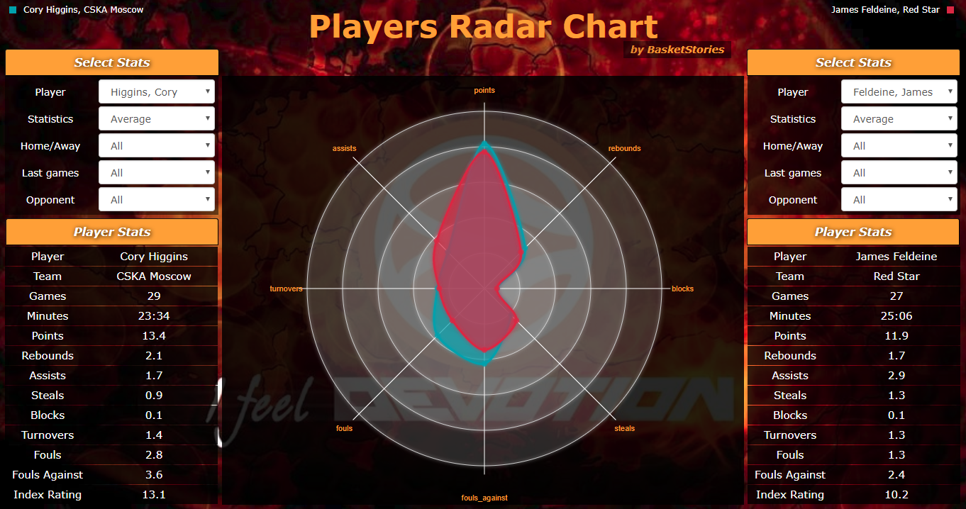 Στη σύγκριση του ραντάρ του BasketStories, δύο ικανότατοι επιθετικοί παίκτες που έχουν αφήσει έντονο το στίγμα τους φέτος στις ομάδες τους. Ξεκινώντας από τους γηπεδούχους, ο Cory Higgins μπορεί να μην είναι ακριβώς το «πρώτο βιολί» σε μια ομάδα που πρωταγωνιστούν ονόματα όπως αυτά των De Colo και Rodriguez, αυτό όμως δεν τον εμποδίζει να πραγματοποιεί φέτος την καλύτερη του σεζόν στην Ευρωλίγκα. Ο Αμερικανός σκοράρει 13,4 πόντους σε 23,5 λεπτά αποτελώντας έναν από τους πιο αποτελεσματικούς παίκτες της «ρωσικής αρκούδας». Ο αντίπαλος του, James Feldeine έχει φέτος πρωταγωνιστικό ρόλο στον Ερυθρό Αστέρα και παρότι προηγείται σε ασίστ (2,9 έναντι 1,7) και κλεψίματα (1,3 έναντι 0,9), είναι πίσω σε πόντους με 11,9 κατά μέσο όρο, αλλά και σε κερδισμένα φάουλ (2,4 έναντι 3,6) παρά τα 25' λεπτά συμμετοχής. Ο Αμερικανός γκαρντ της ΤΣΣΚΑ κερδίζει με περίπου 3 μονάδες περισσότερες σε index rating από τον διεθνή με τα χρώματα της Δομινικανής Δημοκρατίας.