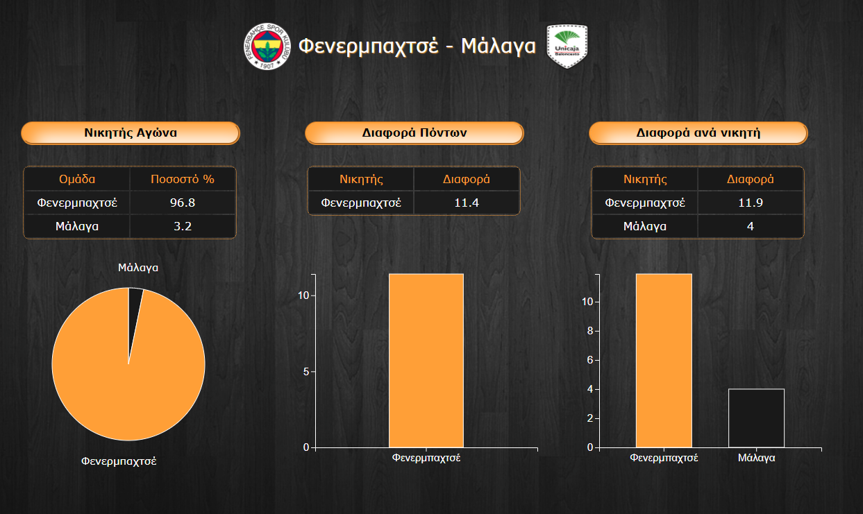 Η Φενερμπαχτσέ είναι το ακλόνητο φαβορί της αναμέτρησης και αυτό αποτυπώνεται χαρακτηριστικά και στις προβλέψεις του PickMaster. Σε ποσοστό που αγγίζει το 96,8% αναμένεται η νίκη των Τούρκων ενώ ένα ισχνό 3,2% πιστεύει στην έκπληξη του διπλού της Μάλαγα. Η μέση διαφορά αναμένεται μεγαλύτερη των 10 πόντων για την ομάδα του Zeljko Obradovic και συγκεκριμένα αγγίζει τους 11,4 πόντους.
