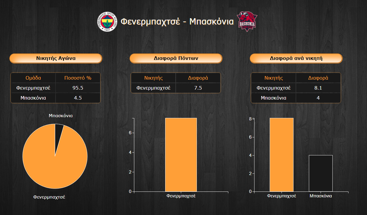- Η Φενερμπαχτσέ διαθέτει μεγαλύτερη σκληράδα αμυντικά, έχοντας παράλληλα και περισσότερα επιθετικά όπλα σε ένα σύνολο που ξεχωρίζει για την αποτελεσματικότητα του συνολικά σε άμυνα και επίθεση. Ωστόσο, η ομάδα του Pedro Martinez δεν υπολείπεται ιδιαίτερα σε ποσοστά με καλύτερη επίδοση στα σουτ δύο πόντων (55,9% έναντι 53,5% των Τούρκων), και περίπου 40% στα τρίποντα με την ομάδα του Obradovic, όμως να είναι ακόμα πιο επικίνδυνη περιφερειακά με 42,4% πίσω από τη γραμμή των 6,75μ. Το περιφερειακό σουτ των δύο ομάδων θα είναι καθοριστικός γνώμονας των αναμετρήσεων καθώς αμφότερες διαθέτουν ικανούς σουτέρ σε ποσότητα και ποιότητα. Οι Βάσκοι σε μια καλή μέρα από τη γραμμή των 6,75μ μπορούν να αξιοποιήσουν αυτό το στοιχείο του παιχνιδιού τους και να γίνουν περισσότερο επικίνδυνοι, τη στιγμή που τα πλήγματα που μπορεί να φέρει η ομάδα του Ομπράντοβιτς από τη γραμμή του τριπόντου είναι γνωστά!