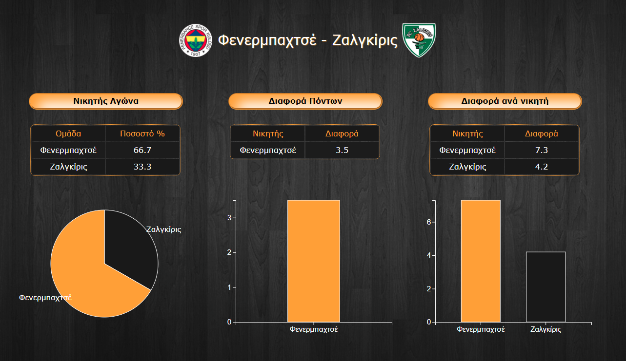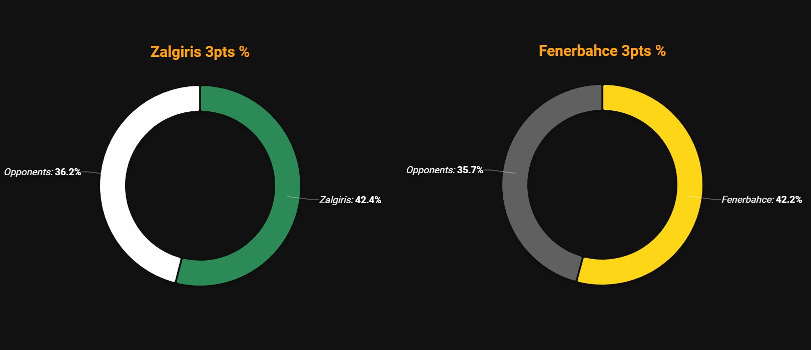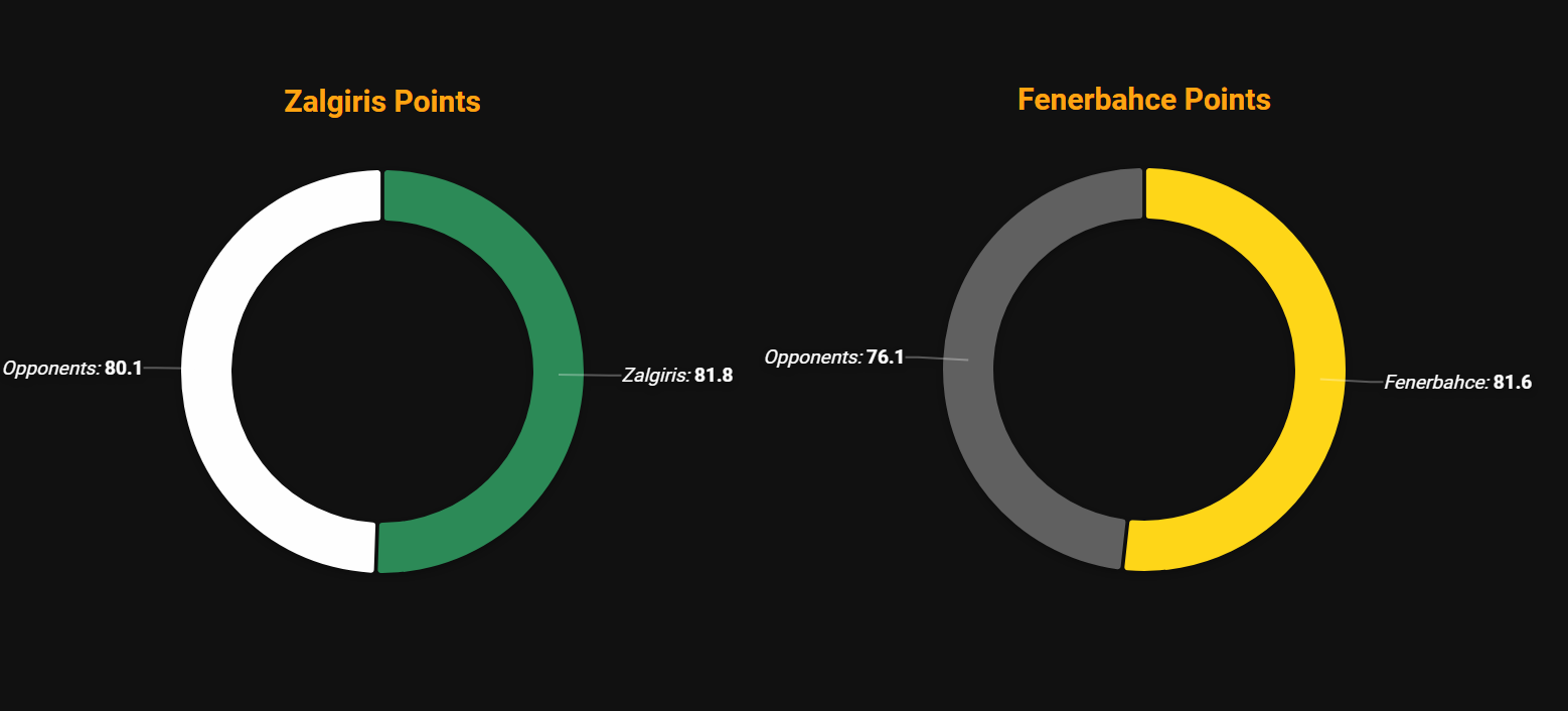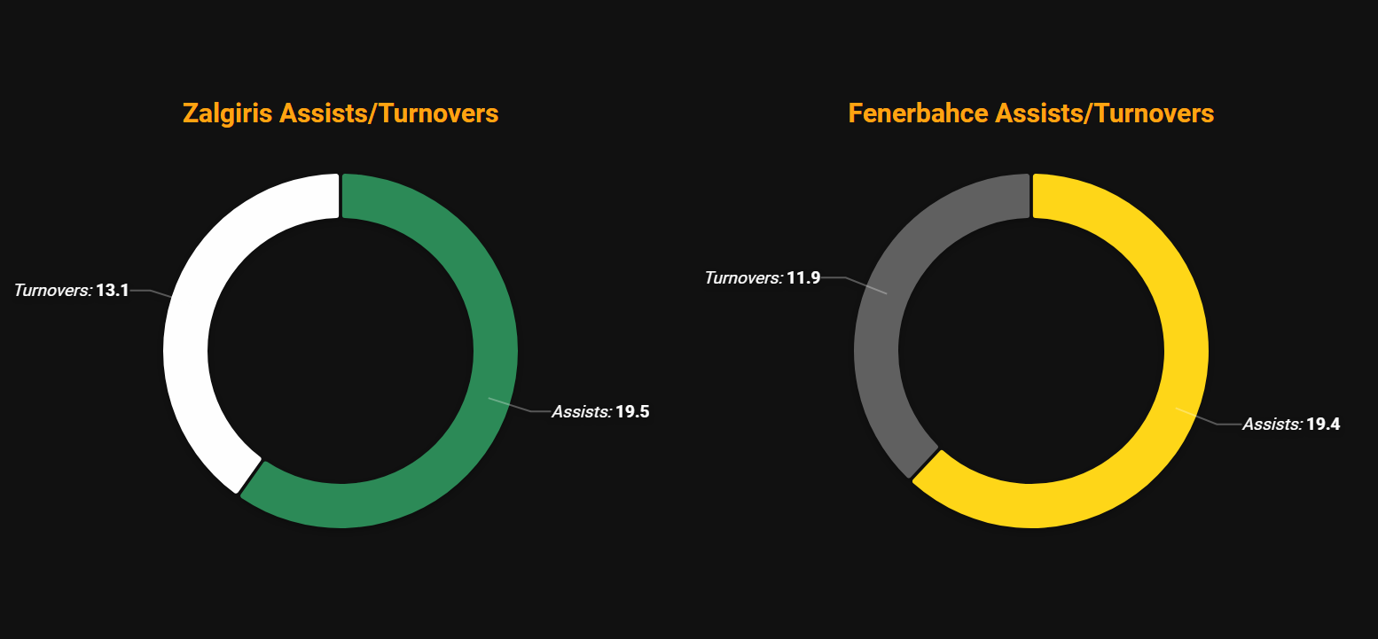 - Η στατιστική σύνοψη της αναμέτρησης δεν προϊδεάζει για τη δεδομένη διαφορά στην ποιότητα των δύο ομάδων καθώς η πρωταθλήτρια Ευρώπης διαθέτει σαφώς μεγαλύτερα ονόματα στη σύνθεση της. Αντίθετα, η εξαιρετική δουλειά που γίνεται φέτος στην πρωταθλήτρια Λιθουανίας φέρνει την Ζαλγκίρις σε περίπου παρόμοια ποσοστά στην επίθεση και μάλιστα ελαφρώς καλύτερα σε δίποντα και τρίποντα με ακόμα μεγαλύτερη αποτελεσματικότητα (54,3% στα δίποντα και 42,2% στα τρίποντα). Ο τομέας στον οποίο ξεκάθαρα προηγείται η Φενερμπαχτσέ είναι μονάχα τα λάθη με 11,9 έναντι 13,1 των Λιθουανών, ενώ και οι ασίστ είναι ένα κομμάτι που η ομάδα του Jasikevicius «κοιτάζει στα μάτια» τους Τούρκους με 19,5 έναντι 19,4 κατά μέσο όρο.