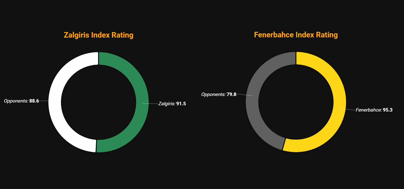 - Από την άλλη πλευρά, ωστόσο, η Φενερμπαχτσέ καταφέρνει να περιορίζει περισσότερο τους αντιπάλους της, όπως μαρτυρά το +15,5 που έχει στο Index Rating σε σχέση με αυτούς, την στιγμή που το αντίστοιχο νούμερο για την Ζαλγκίρις φτάνει μόλις στο +2,9. Με 80,1 πόντους παθητικό, έναντι των 76,1 της Φενέρ, είναι φανερό ότι η λιθουανική ομάδα θα πρέπει να αποδειχθεί το ίδιο καλή και αποτελεσματική και στην άμυνά της, αν θέλει να έχει αξιώσεις να εκθρονήσει την πρωταθλήτρια του 2017.