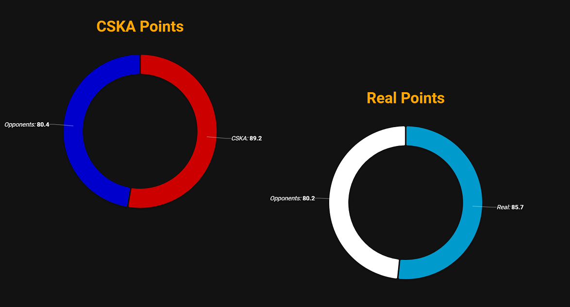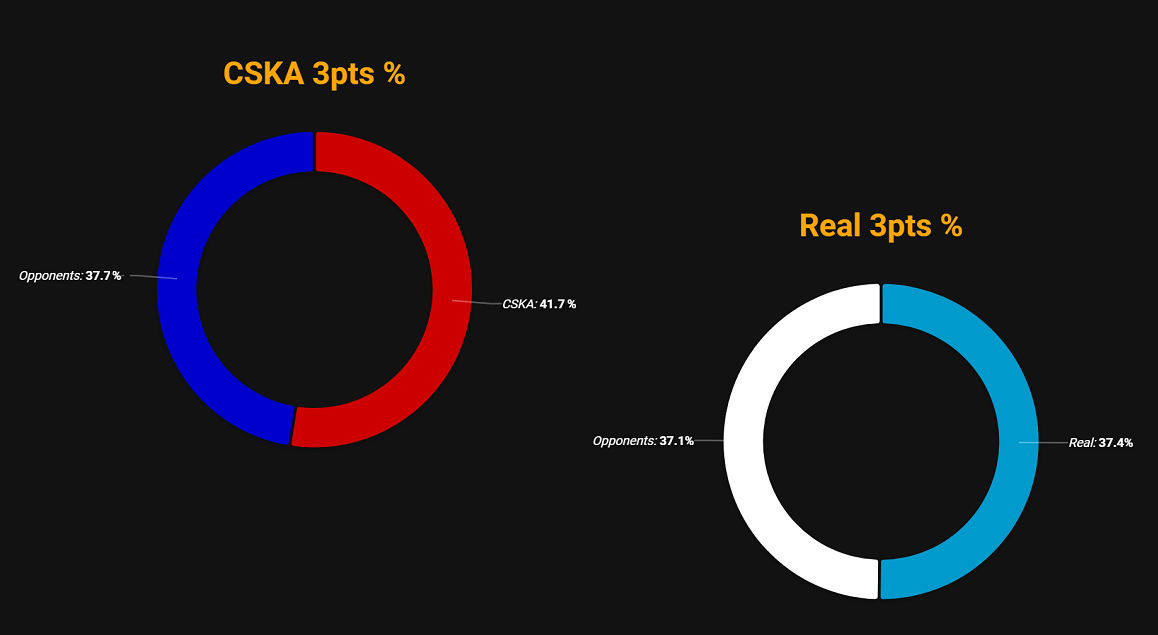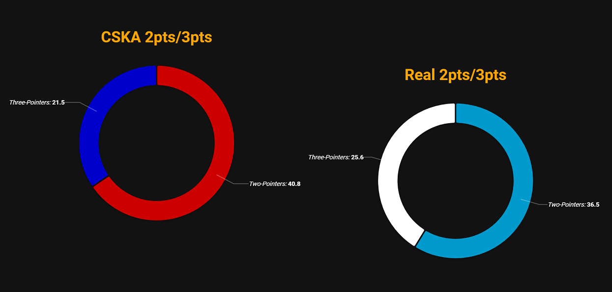 - Οι δύο ομάδες σουτάρουν με παρόμοια ποσοστά στα δίποντα με την ΤΣΣΚΑ να παρουσιάζεται πιο αποτελεσματική στο περιφερειακό σουτ (με 41,1% έναντι 37,4%), αλλά τους Μαδριλένους να είναι η ομάδα που δείχνει μεγαλύτερη τάση στις προσπάθειες πίσω από τη γραμμή των 6,75μ. με τον δείκτη διπόντων/τριπόντων να αγγίζει το 1,43 σε αντίθεση με τον αντίστοιχο των πρωταθλητών της VTB League που δεν υποχωρεί κάτω από το 1,9.