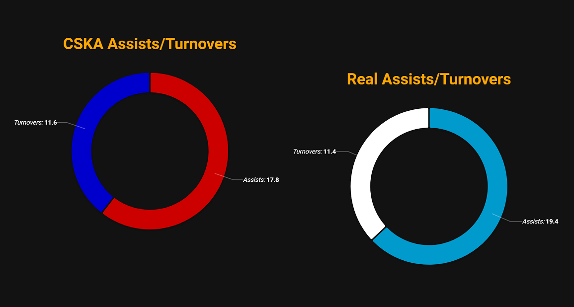 - Η ομάδα του Pablo Laso σε ίδιο αριθμό κατοχών, είναι ανώτερη σε αναλογία ασίστ/λαθών με 19,4 ασίστ κατά μέσο όρο έναντι 17,8 των Ρώσων σε έναν στατιστικό τομέα που είναι ιδιαίτερα κρίσιμος στα μεγάλα παιχνίδια.