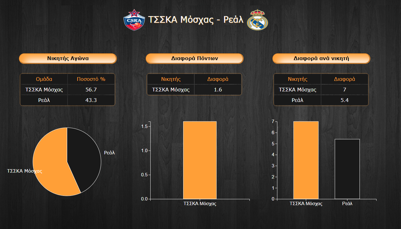 Όσον αφορά τις προβλέψεις του PickMaster που οδηγείται και αυτό σιγά σιγά στο τέλος του, τα πράγματα είναι περίπου μοιρασμένα με το οριακό προβάδισμα να δίνεται στην ΤΣΣΚΑ Μόσχας με 56,7% ποσοστό νίκης και τη Ρεάλ να εισπράττει το υπόλοιπο 43,3%, με την εικόνα να προμηνύει ένα πραγματικό ντέρμπι καθώς η μέση διαφορά δεν ξεπερνά τους δύο πόντους υπέρ των Μοσχοβιτών. Τέλος, οι επί μέρους προβλέψεις για την τελική διαφορά αγγίζουν τους 7 πόντους από τη μερίδα που επέλεξε τη νίκη της ομάδας του Δημήτρη Ιτούδη και λίγο χαμηλότερα (5,4) διαμορφώνεται η μέση διαφορά όσων επέλεξαν τη νίκη της «βασίλισσας».