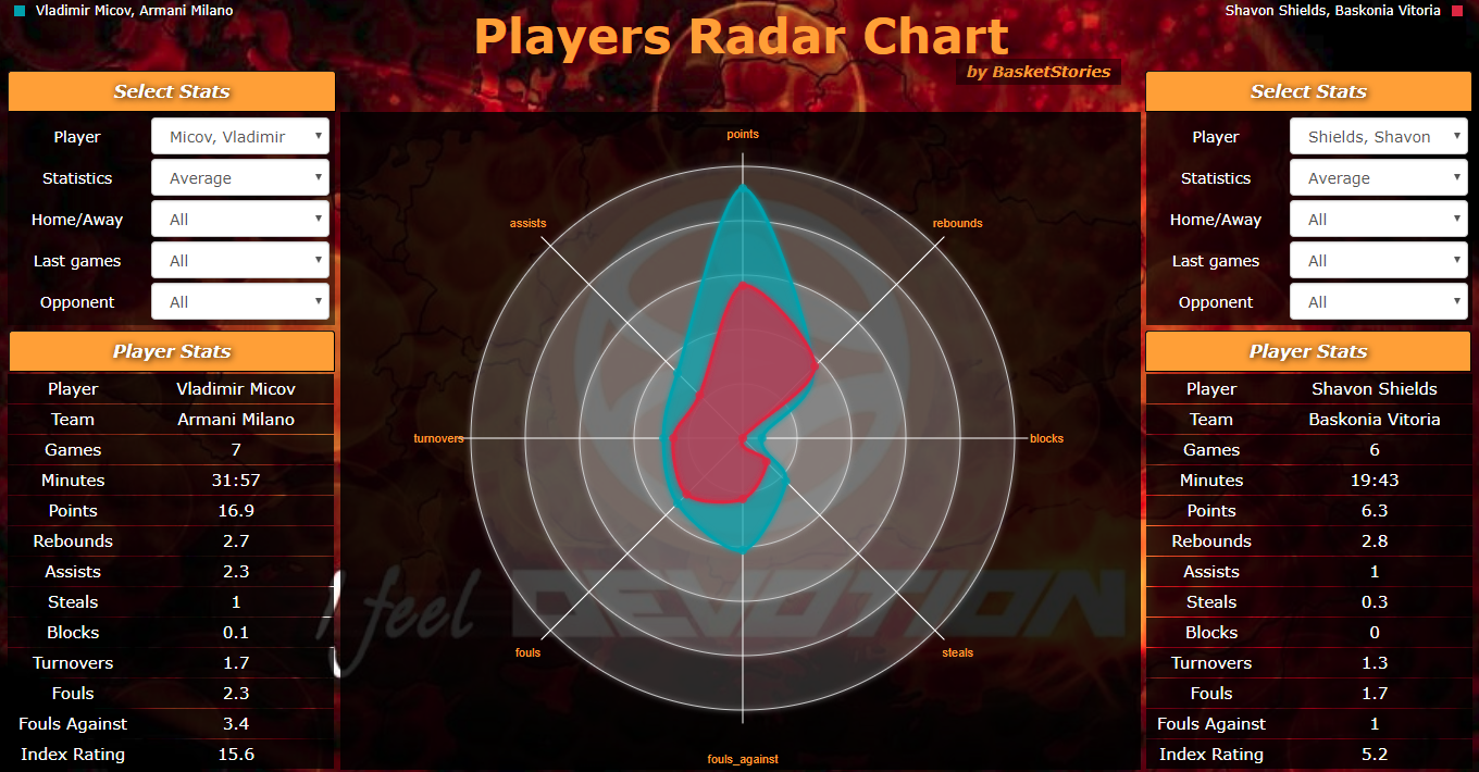 Μπορεί ο Mike James να είναι ο μεγάλος πρωταγωνιστής του παιχνιδιού της Μιλάνο, αλλά καθόλου αμελητέα δεν είναι και η παρουσία του Micov ο οποίος διανύει εξαιρετική περίοδο στην εκκίνηση της φετινής σεζόν με 16,9 πόντους, 2,7 ριμπάουντ και 2,3 ασίστ μέσο όρο. Αντίθετα, ο βασικός σμολ φόργουορντ των Βάσκων Shavon Shields μετά από τον τραυματισμό του τη 2η αγωνιστική δεν κατάφερε να βρει ακόμα αγωνιστικό ρυθμό μένοντας αισθητά χαμηλότερα από τον προσωπικό τους αντίπαλο με 6,3 πόντους, 2,8 ριμπάουντ και 1 ασίστ κατά μέσο όρο με τη διαφορά στα μεταξύ τους ranking να αγγίζει τις 10,4 μονάδες, διαφορά που θα μπορούσε να χωρέσει έναν ακόμα ολόκληρο παίκτη!