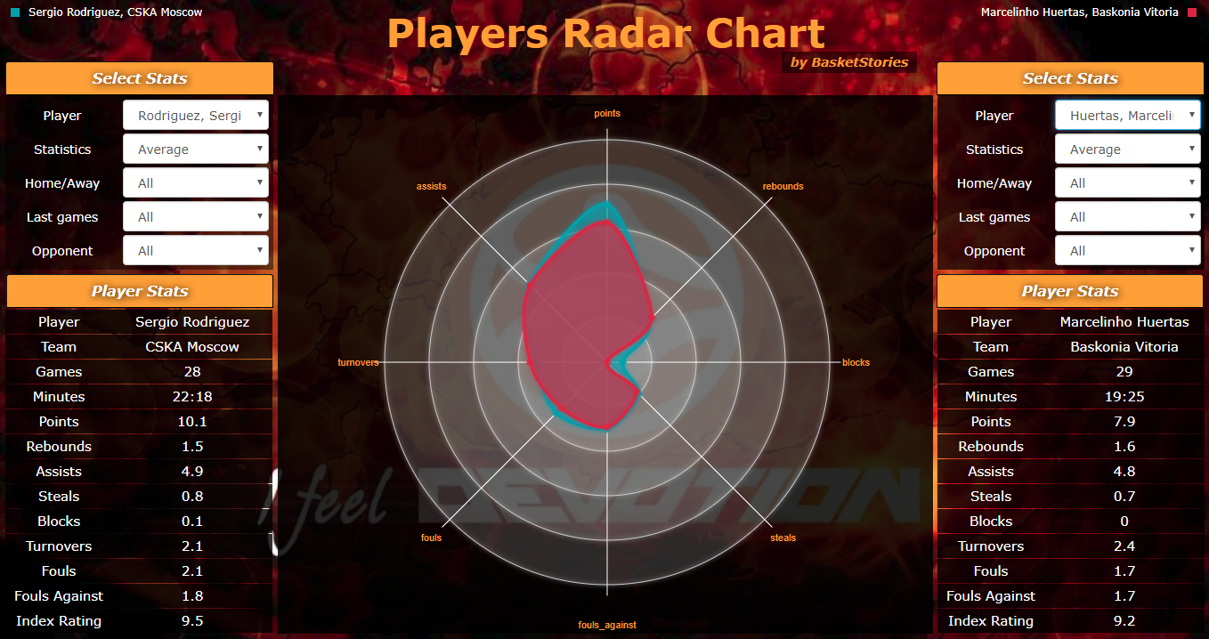 Δύο από τους πιο έμπειρους και θεαματικούς πόιντ γκαρντ της λίγκας σε μια ακόμα μεταξύ τους μονομαχία. Ο Sergio Rodriguez στη δεύτερη του σεζόν με τα χρώματα της ΤΣΣΚΑ σημειώνει 10,1 πόντους και 4,9 ασίστ σε 22,5 περίπου λεπτά συμμετοχής, ενώ από την άλλη πλευρά ο Marcelo Huertas σε 3 λεπτά λιγότερα μοιράζει περίπου τον ίδιο αριθμό ασίστ (4,8), αλλά με ελαφρώς χειρότερη επίδοση στα λάθη (2,4 έναντι 2,1) και κυρίως στους πόντους με 7,9 κατά μέσο όρο. Η σύγκριση των δύο παικτών που μεταξύ άλλων έχουν παρεμφερή νούμερα σε ριμπάουντ, κλεψίματα και φάουλ, καταλήγει σε ισοπαλία με οριακό προβάδισμα του Ισπανού γκαρντ της ρωσικής ομάδας.