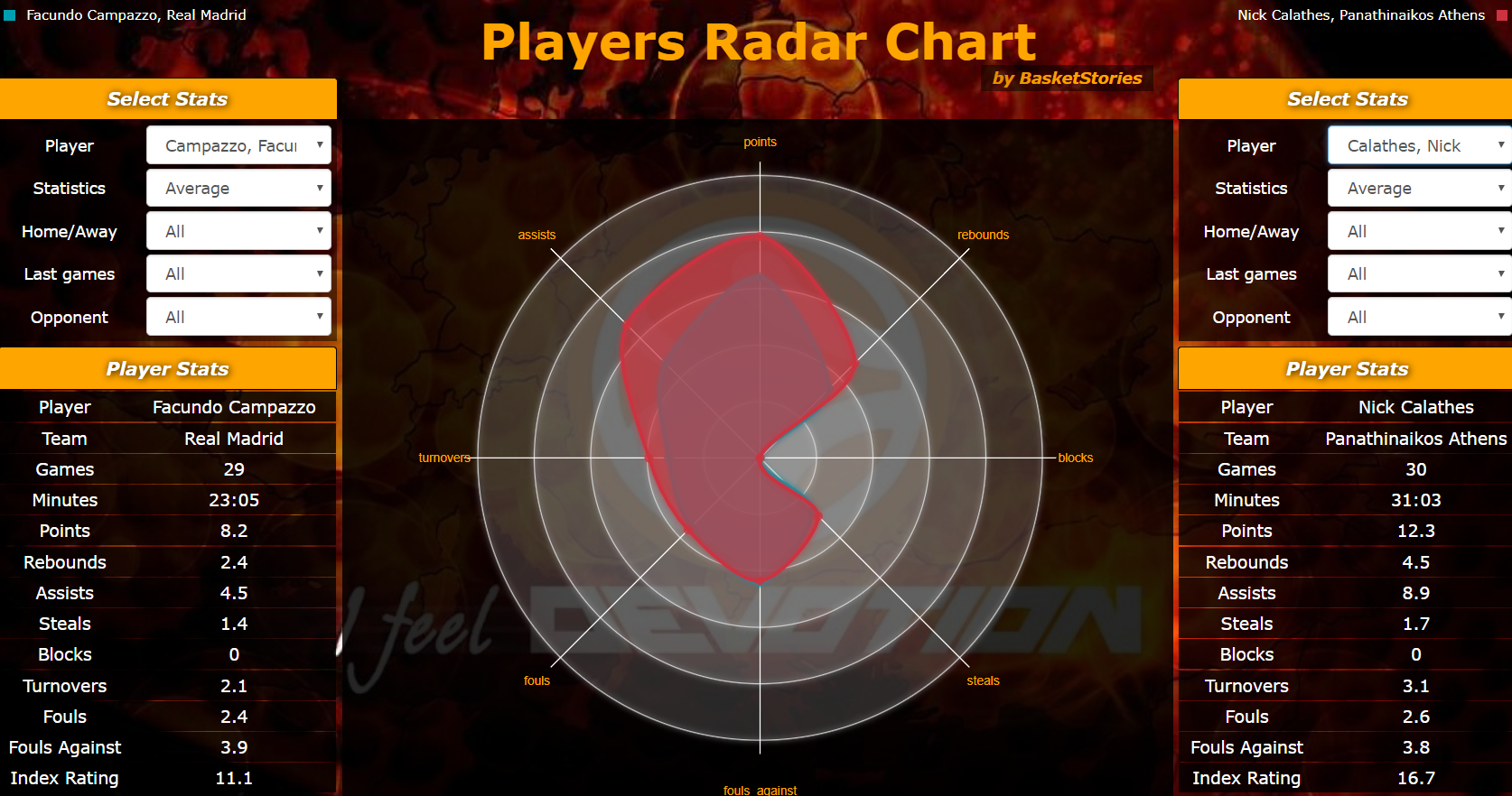 Από την άλλη, ο Campazzo πετυχαίνει 8.2 πόντους, μαζεύει 2.4 ριμπάουντς, μοιράζει 4.5 τελικές, πραγματοποιεί 1.4 κλεψίματα, υποπίπτει σε 2.1 λάθη και σε 2.4 φάουλ, ενώ κερδίζει 3.9 για 11.1 μονάδες στο σύστημα αξιολόγησης σε 23:05 που αγωνίζεται κατά μ.ο. Προφανώς, Llull απόντος, ο χρόνος συμμετοχής του θα αγγίζει ή και θα ξεπερνάει τα 30 λεπτά στη σειρά, με τον Αργεντίνο να έχει αγωνιστεί τέσσερις φορές φέτος πάνω από το συγκεκριμένο όριο και τα νούμερά του να εκτινάσσονται στους 16.75 πόντους, 2.5 ριμπάουντς, 6.75 ασσίστς, 2.25 κλεψίματα και 22.25 ράνκινγκ. Δεν είχε, ωστόσο, τον Καλάθη αντίπαλο.