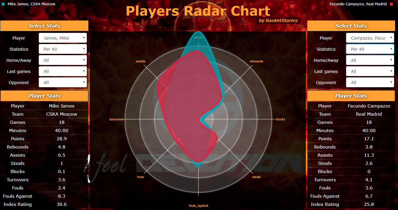 Μπορεί ο Mike James να "σπάει κάθε κοντέρ" φέτος με την παρουσία του στην ΤΣΣΚΑ και ο Campazzo να κάνει περισσότερο "αθόρυβη δουλειά" λόγω του χαμηλότερου χρόνου συμμετοχής του ωστόσο στην αναγωγή ανά 40 λεπτά, βλέπουμε ότι η διαφορά ανάμεσα στους δύο παίκτες δεν είναι τόσο μεγάλη. Ο Αμερικανός της ΤΣΣΚΑ στη σύγκριση των αριθμών χωρίς τον παράγοντα του χρόνου συμμετοχής του, βλέπουμε ότι σημειώνει μεν αρκετά υψηλότερο αριθμό πόντων, αλλά υπολείπεται αισθητά σε ασίστ και κλεψίματα διατηρώντας πάντως περισσότερα κερδισμένα φάουλ. Συνολικά δηλαδή ο James είναι ένας φύσει επιθετικά παίκτης σε αντίθεση με τον Αργεντινό διεθνή που δείχνει πολύ πιο παραγωγικός στις ασίστ με τη διαφορά ανάμεσα στους δύο παίκτες να μην ξεπερνά τελικά τις 5 μονάδες στο ranking σύμφωνα πάντα με το index rating τους σε αναγωγή στα 40 λεπτά και για τους δύο.