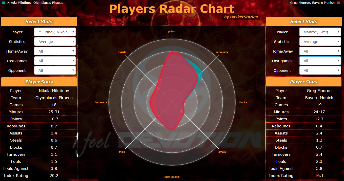 Η μονομαχία των Milutinov και Monroe στο "ζωγραφιστό" ξεχωρίζει στην αναμέτρηση καθώς οι δύο σέντερ ανήκουν στην ελίτ της διοργάνωσης ξεχωρίζοντας με τη στατιστική τους και την επίδραση τους στην ομάδα τους παρά την κακή πορεία που έχουν αυτές. Ο Σέρβος σέντερ φέτος σε 18 παιχνίδια ξεχωρίζει με 10,7 πόντους και 8,7 ριμπάουντ μοιράζοντας παράλληλα 1,4 ασίστ ανά παιχνίδι και κερδίζοντας 3,8 φάουλ σε 25,5 λεπτά συμμετοχής. Από την άλλη πλευρά, ο πρώην NBAer σε περίπου 1,5 λεπτό λιγότερο στο παρκέ, σκοράρει 2 πόντους περισσότερους και μοιράζει μία ασίστ περισσότερη από τον Σέρβο διεθνή, αλλά υπολείπεται σε ριμπάουντ με 2,3 λιγότερα και υποπίπτει σε 1,3 περισσότερα λάθη ανά παιχνίδι φτάνοντας τελικά τις 16,1 μονάδες στο ranking. Ο σέντερ του Ολυμπιακού συγκεντρώνει με τη σειρά του 4,1 περισσότερες μονάδες στην αξιολόγηση.