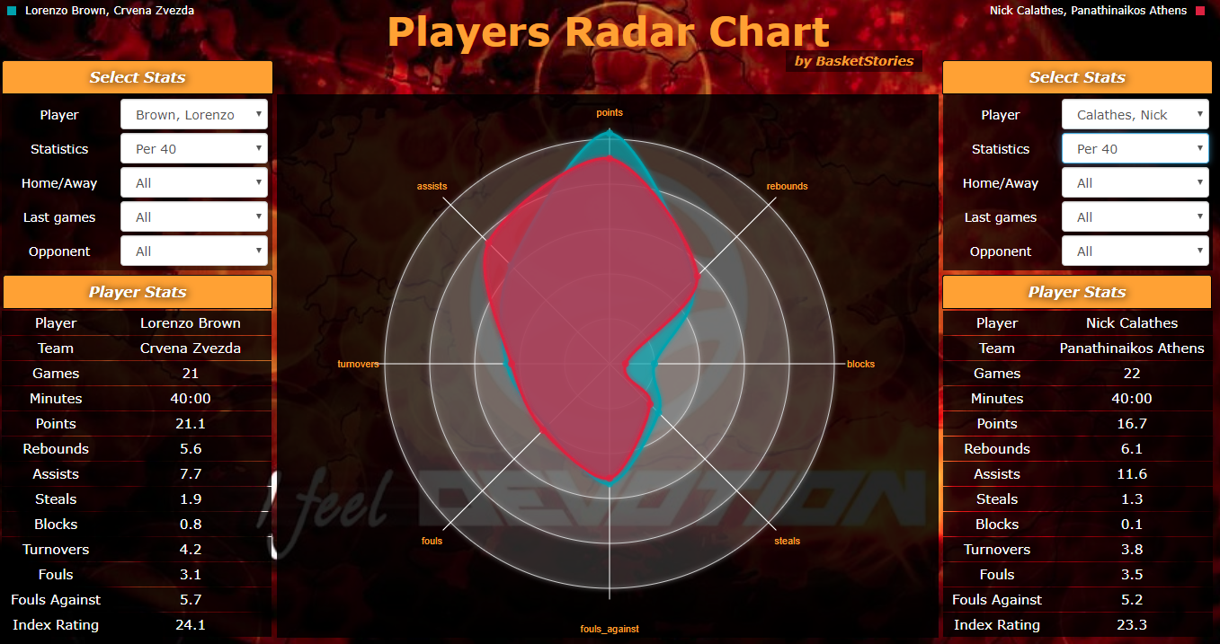 Ο Νικ Καλάθης αποτελεί τον "κινητήριο μοχλό" του Παναθηναϊκού ξεχωρίζοντας για ακόμα μια σεζόν με τις επιδόσεις του και έχει πάντοτε ενδιαφέρον να εξετάζουμε τα νούμερα του στην αναλογία των 40 λεπτών καθώς παραμένει σημαντικά για μεγαλύτερο χρονικό διάστημα στο παρκέ κατά μέσο όρο από όλους σχεδόν τους γκαρντ της διοργάνωσης. Στη συγκεκριμένη περίπτωση ο Έλληνας γκαρντ παίζει για 7 περισσότερα λεπτά από το "πρώτο βιολί" του Ερυθρού Αστέρα Lorenzo Brown ξεπερνώντας τον Αμερικανό κατά 3,7 μονάδες στο ranking. Στην αναγωγή στα 40 λεπτά όμως βλέπουμε ότι ο Έλληνας διεθνής εξακολουθεί να κάνει τη διαφορά με τις ασίστ (11,6 έναντι 7,7) και έχει λιγότερα λάθη και περισσότερα ριμπάουντ δείχνοντας από την άλλη να υπολείπεται σημαντικά σε πόντους με 16,7 έναντι 21,1 του σκόρερ του Ερυθρού Αστέρα. Τελικά, ο Αμερικανός γκαρντ ξεπερνά τον Καλάθη για 0,8 μονάδες δείχνοντας με τη σειρά του ότι και αυτός πραγματοποιεί μια αρκετά καλή σεζόν στην πρώτη του χρονιά στην Euroleague.
