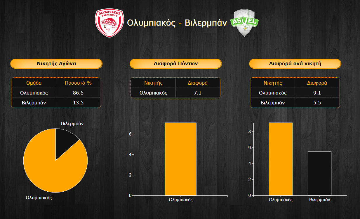 - Οι ερυθρόλευκοι έχουν τον πρώτο λόγο στην αναμέτρηση σύμφωνα με την ανάλυση των αριθμών καθώς ο Ολυμπιακός σκοράρει 7,3 περισσότερους πόντους ανά παιχνίδι σε σχέση με τη Βιλερμπάν καταγράφοντας συνολικά 5,3 περισσότερους πόντους στο σύνολο ενεργητικού-παθητικού με τη διαφορά στα ranking να είναι επίσης αρκετά μεγάλη.