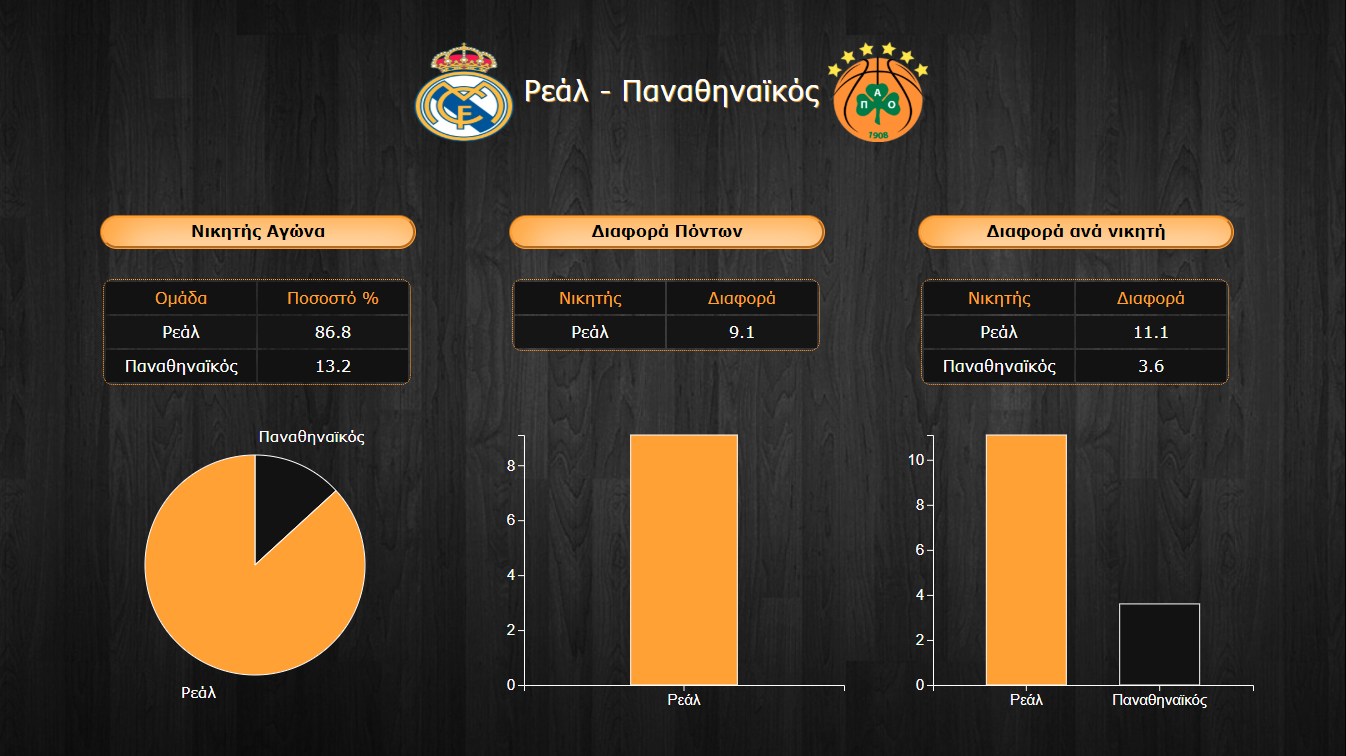 - Η ομάδα του τριφυλλιού πάντως δείχνει ότι επιθετικά μπορεί να συναγωνιστεί τις επιδόσεις των Μαδριλένων όπως αποτυπώνεται και στον δείκτη ασίστ/λαθών όπου οι πρωταθλητές Ελλάδας αν και υπολείπονται σε ασίστ με 1,4 λιγότερες ανά παιχνίδι, υποπίπτουν σε ένα λάθος λιγότερο ανά παιχνίδι διατηρώντας την κορυφαία επίδοση της διοργάνωσης σε αυτόν τον τομέα. Ωστόσο, οι αμυντικές αδυναμίες των πράσινων που επιτρέπουν υψηλότερα ποσοστά σε δίποντα (51,3% έναντι 48,3% του παθητικού της Ρεάλ) και υψηλότερο δείκτη ασίστ/λαθών στους αντιπάλους τους από την εξαιρετική Ρεάλ (1,53 για τους αντιπάλους του Παναθηναϊκού και μόλις 1,12 για τους αντιπάλους των Μαδριλένων), φαίνεται ότι είναι το βασικότερο μειονέκτημα της ελληνικής ομάδας.