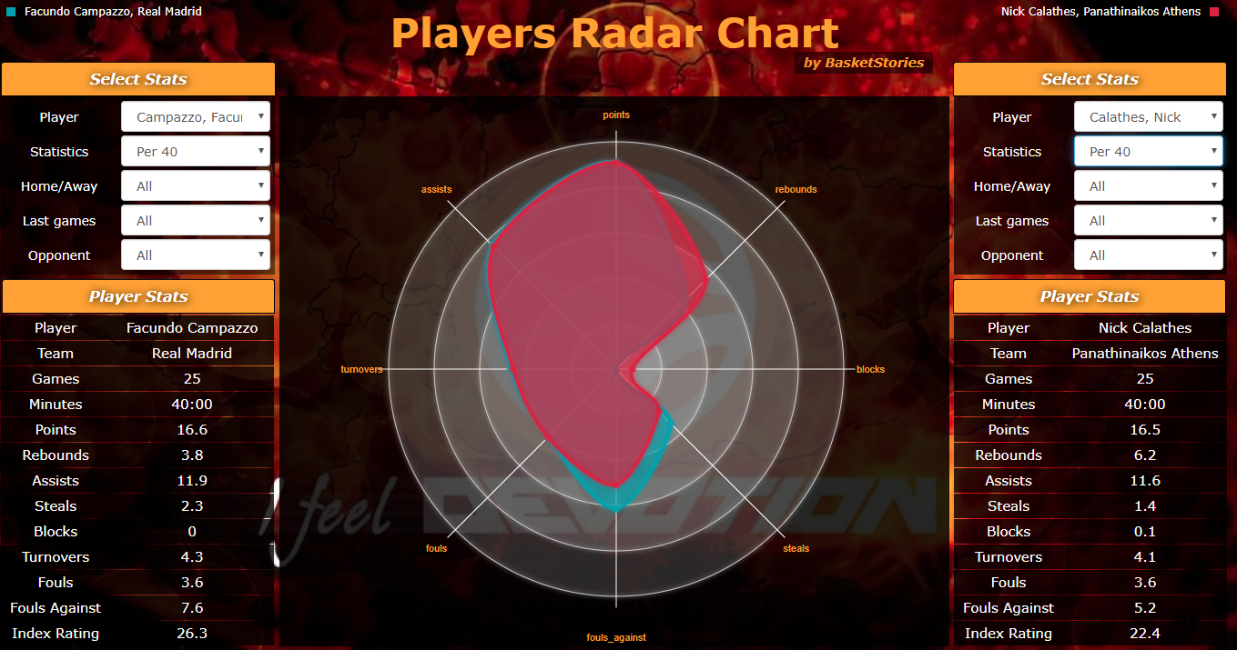 Πρόκειται ίσως για τους δύο κορυφαίους πασέρ της διοργάνωσης και τουλάχιστον σύμφωνα με τους αριθμούς και τη σύγκριση τους σε αναγωγή 40 λεπτών, αυτό δείχνει να επιβεβαιώνεται πανηγυρικά. Ο Facundo Campazzo μοιράζει 11,9 ασίστ έναντι 11,6 του Έλληνα γκαρντ σημειώνοντας μάλιστα την ίδια επίδοση σε πόντους και προηγούμενος σε κλεψίματα, αλλά με λιγότερα ριμπάουντ (3,8 έναντι 6,2 του γκαρντ του Παναθηναϊκού). Στην αναγωγή σε 40 λεπτά δηλαδή βλέπουμε ότι ο Αργεντινός γκαρντ της Ρεάλ (που αγωνίζεται κατά 8 λεπτά λιγότερα από τον Καλάθη) προηγείται τελικά με 3,9 μονάδες σε ranking του διεθνή με την Εθνική Ελλάδος. Ο γκαρντ των πρασίνων εξακολουθεί να υπερέχει σε απόλυτους αριθμούς με 18,2 μονάδες σε μέσο όρο ranking έναντι 16 του Αργεντινού διεθνή που και εδώ έχει μικρή μόνο διαφορά επιβεβαιώνοντας με τη σειρά του τη δική του κλάση.