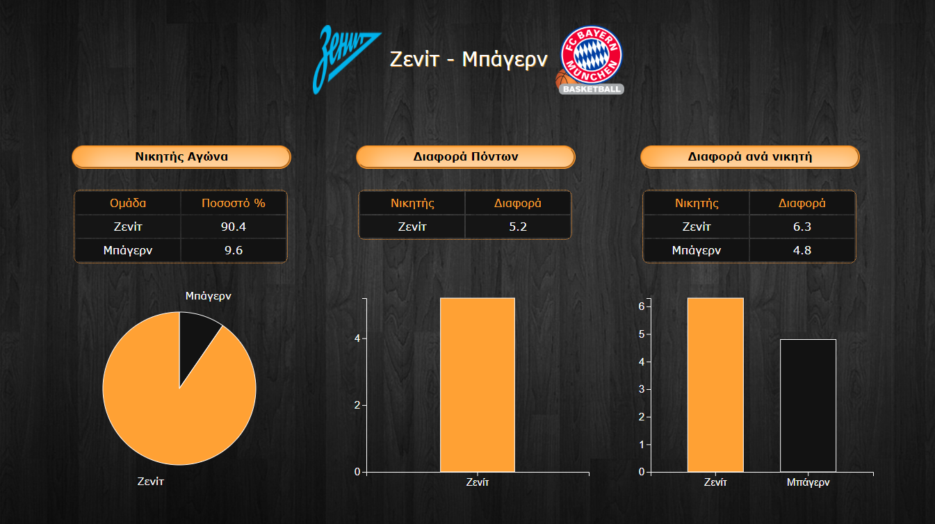 - Το μοναδικό σημείο που η γερμανική ομάδα δείχνει να έχει το πάνω χέρι είναι η εκτελεστική δεινότητα από τη γραμμή του τριπόντου από που φτάνει το 38,5% έναντι του 33,3% της Ζενίτ που προηγείται όμως σημαντικά στο ποσοστό διπόντων με 53% έναντι 49,9% της ομάδας του Kostic.
