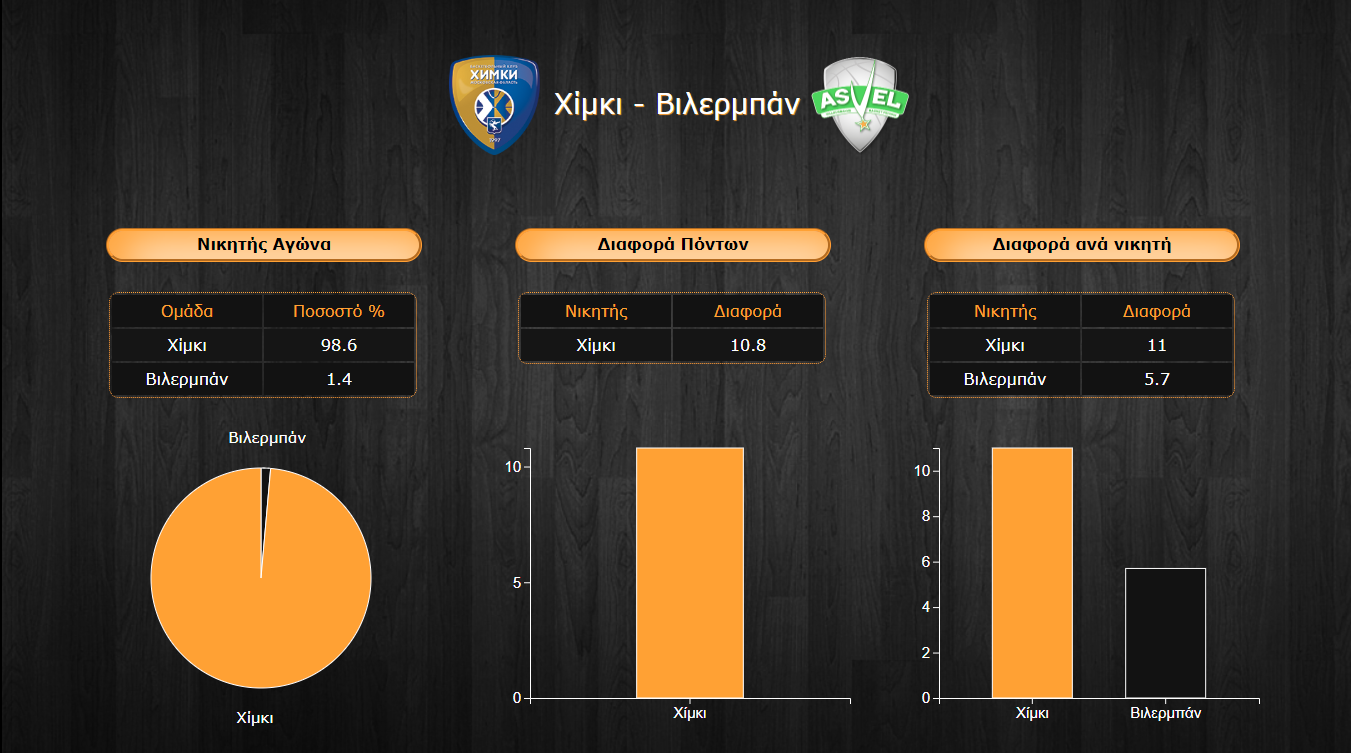 Η επιλογή για τη νίκη της Χίμκι είναι συντριπτική με το 98,6% να πιστεύει σε επικράτηση των Ρώσων και την τελική διαφορά να φτάνει τα διψήφια επίπεδα (10,8 π.) δείχνοντας ότι τα προγνωστικά περιμένουν ένα σχετικά εύκολο απόγευμα για την ομάδα της Μόσχας.