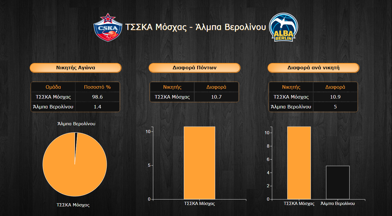 - Ένα ενθαρρυντικό στοιχείο για την Άλμπα πάντως είναι η υπεροχή της στον τομέα των ασίστ/λαθών καθώς προηγείται με 2,9 ασίστ περισσότερες ανά παιχνίδι με ελάχιστα περισσότερα λάθη συγκεντρώνοντας έτσι 1,41 στον δείκτη έναντι μόλις 1,26 της ΤΣΣΚΑ που είναι όμως ομάδα με σαφώς μεγαλύτερη ποιότητα στην ατομική φάση που βασίζει το παιχνίδι της περισσότερο από τη δημιουργία από ασίστ που χαρακτηρίζει το παιχνίδι των Γερμανών.