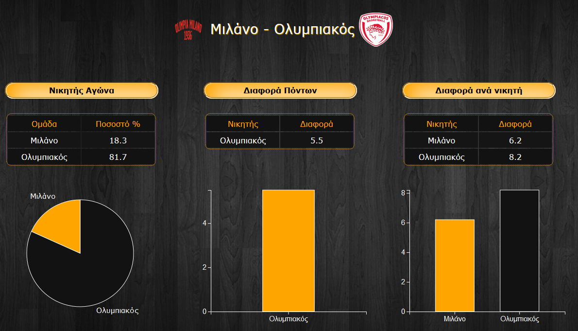 Ο Ολυμπιακός υποχρεώνει τους αντιπάλους του σε χαμηλά ποσοστά σε δίποντα και τρίποντα με τους Ιταλούς να φαίνονται ιδιαίτερα επικίνδυνοι από τη γραμμή των 6,75μ. με ποσοστά της τάξης του 38%, αλλά ιδιαίτερα αναποτελεσματικοί στα σουτ δύο πόντων με μόλις 46,9%. Οι ερυθρόλευκοι προηγούνται στα ριμπάουντ, αλλά όχι στις ασίστ, ενώ χαρακτηριστικά έχουν χειρότερο δείκτη ασίστ/λαθών με 1,18 έναντι 1,54 των Ιταλών. Τα λάθη, αλλά και το ποσοστό πίσω από τα 6,75 θα παίξει μεγάλο ρόλο στην έκβαση της αναμέτρησης.