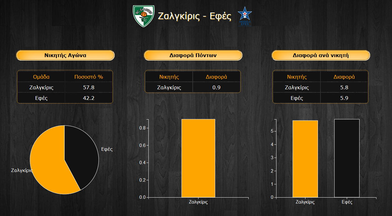 Απρόβλεπτη η αναμέτρηση μεταξύ των δύο ομάδων, κάτι λογικό, αφού από τη μια η Ζαλγκίρις ενώ έχει κάνει εκπλήξεις εκτός έδρας, δείχνει πιο ευάλωτη στο Κάουνας, ενώ η Εφές έχει ανεβάσει ρυθμούς τις τελευταίες αγωνιστικής. Η τρέχουσα προτίμηση του κοινού του PickMaster Euroleague δείχνει Ζαλγκίρις με ποσοστό 57,8%, έναντι 42,2% της Εφές. Οι επιμέρους διαφορές των δύο ομάδων είναι παρεμφερείς και οριακά χαμηλότερα από τους 6 πόντους για την καθεμιά, κάτι που διαμορφώνει την τελική διαφορά του αγώνα βάσει του συνόλου των προβλέψεων στους 0,9 πόντους για την Ζαλγκίρις. Σε κάθε περίπτωση, όλα είναι ανοιχτά και κανένα αποτέλεσμα δεν θα αποτελέσει έκπληξη, με όσο μεγάλη διαφορά κι αν έρθει.