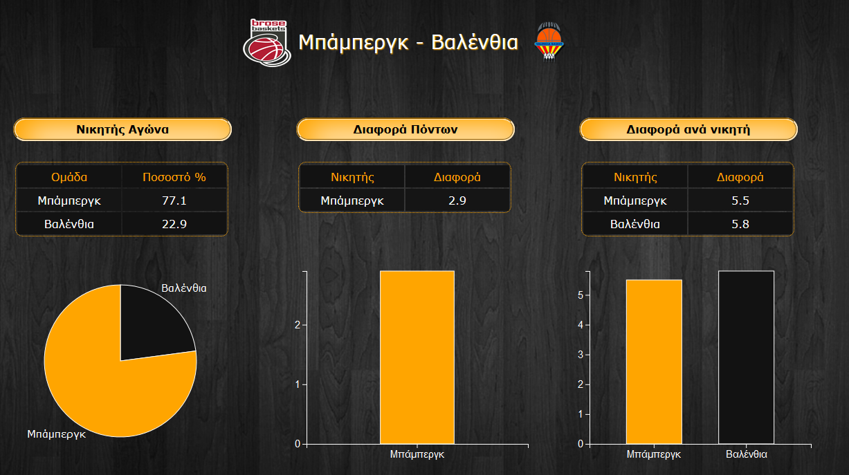 Η Μπάμπεργκ φαίνεται να υπολείπεται επιθετικά της Βαλένθια σκοράροντας κατά μέσο όρο 3,8 πόντους λιγότερους, ενώ παράλληλα σουτάρει και με χαμηλότερα ποσοστά από τους πρωταθλητές Ισπανίας. Στις περισσότερες κατηγορίες υπάρχει πάντως σχετική ισορροπία με ελαφρύ προβάδισμα των Ισπανών στα ριμπάουντ και τις ασίστ. Να σημειωθεί ότι η Βαλένθια βρίσκεται παρά το κακό σερί της στην τέταρτη θέση στη λίστα της αναλογίας ασίστ/λαθών με 1,58, όπως και στη λίστα ασίστ/πόντων με 0,23. Τέλος, οι δύο ομάδες βρίσκονται στις δύο τελευταίες θέσεις των κατοχών επιλέγοντας κυρίως σετ παιχνίδι και χαμηλό τέμπο.