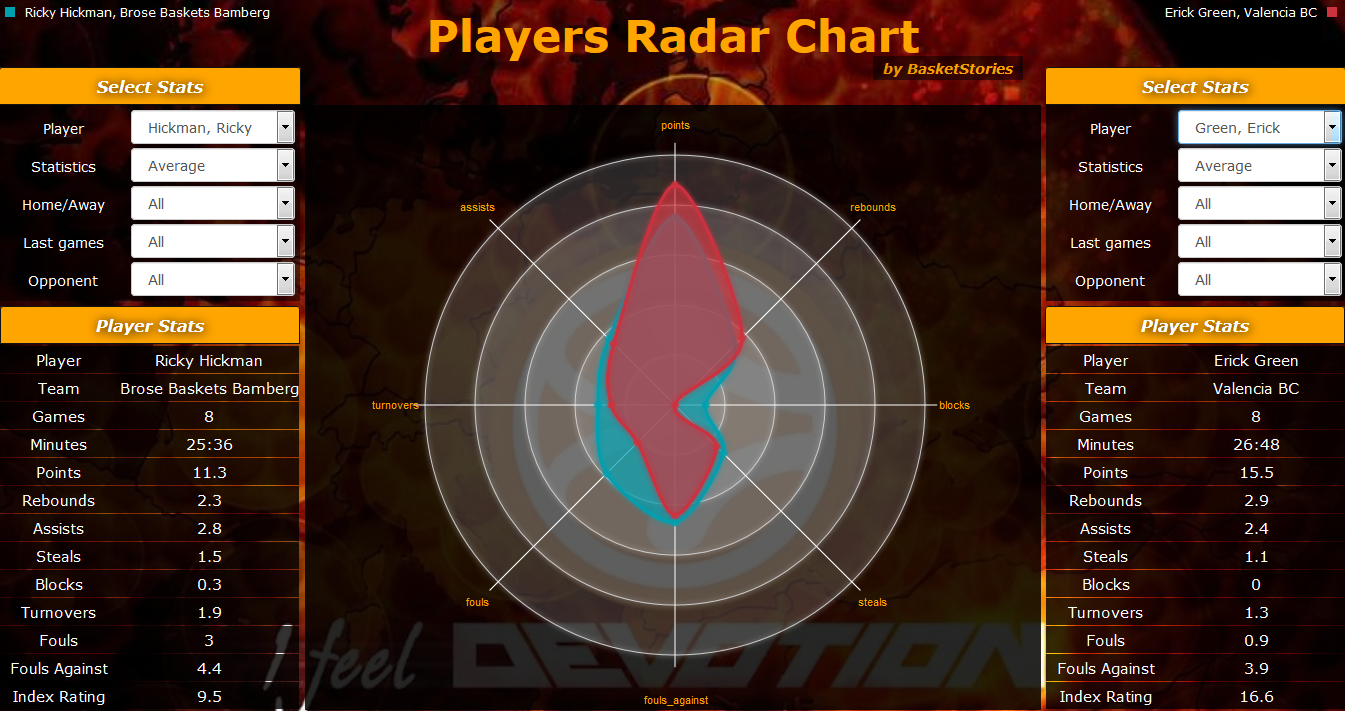 Οι δύο γκαρντ που ξεχωρίζουν στα πρώτα 8 παιχνίδια για τις δύο ομάδες είναι ο Ricky Hickman για την Μπάμπεργκ και ο Erick Green για τη Βαλένθια. Ο έμπειρος Hickman «γράφει» κατά μέσο όρο 11,3 πόντους, 2,3 ριμπάουντ, 2,8 ασίστ και 1,5 κλέψιμο με πολύπλευρη συμβολή στην επίθεση των Γερμανών. Από την άλλη, οι νυχτερίδες δεν θα ήταν ίδιες επιθετικά χωρίς το ταλέντο του Erick Green που φέτος παίζει πολύ απελευθερωμένα έχοντας μεγαλύτερη ευχέρεια κινήσεων και πρωτοβουλιών. Ο Αμερικανός σούτινγκ γκαρντ σκοράρει 15,5 πόντους με 2,9 ριμπάουντ, 2,4 ασίστ και 1,1 κλέψιμο, με καλύτερη επίδοση στα λάθη και λίγο χαμηλότερα στα κερδισμένα φάουλ.