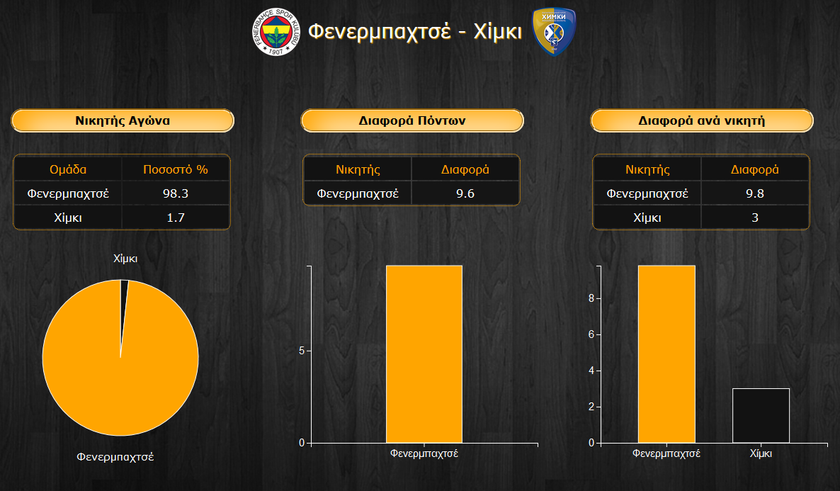 Το ότι η πρωταθλήτρια Φενερμπαχτσέ αποτελεί πάντα το "αφεντικό" στην έδρα της το γνωρίζουν όλοι, όμως το ποσοστό υπέρ της στη αναμέτρηση με την ισχυρή Χίμκι είναι συντριπτικό, καθώς ανέρχεται στο 98,3%, κάτι που εξηγείται ίσως κι από τα μηδαμινά περιθώρια για νέες απώλειες από τους Τούρκους (αν και το διπλό στην Μόσχα "κάλυψε" κάποιες αναπάντεχες ήττες), αλλά και από το πολύ κακό τελευταία μομέντουμ των Ρώσων, στους οποίους πιστεύει μόλις το 1,7% των παικτών του PickMaster Euroleague. Εύλογα, η επιμέρους διαφορά του διπλού δεν είναι μεγάλη, μόλις 3 πόντους, ενώ η ενδεχόμενη νίκη της Φενέρ προβλέπεται σε διψήφια σχεδόν διαφορά, στους 9,8 πόντους. Δεδομένων των λίγων προτιμήσεων στην ομάδα του Γιώργου Μπαρτζώκα, η συνολική διαφορά δεν απέχει και πολύ, καθώς ανέρχεται αυτή τη στιγμή στους 9,6 πόντους υπέρ των γηπεδούχων.