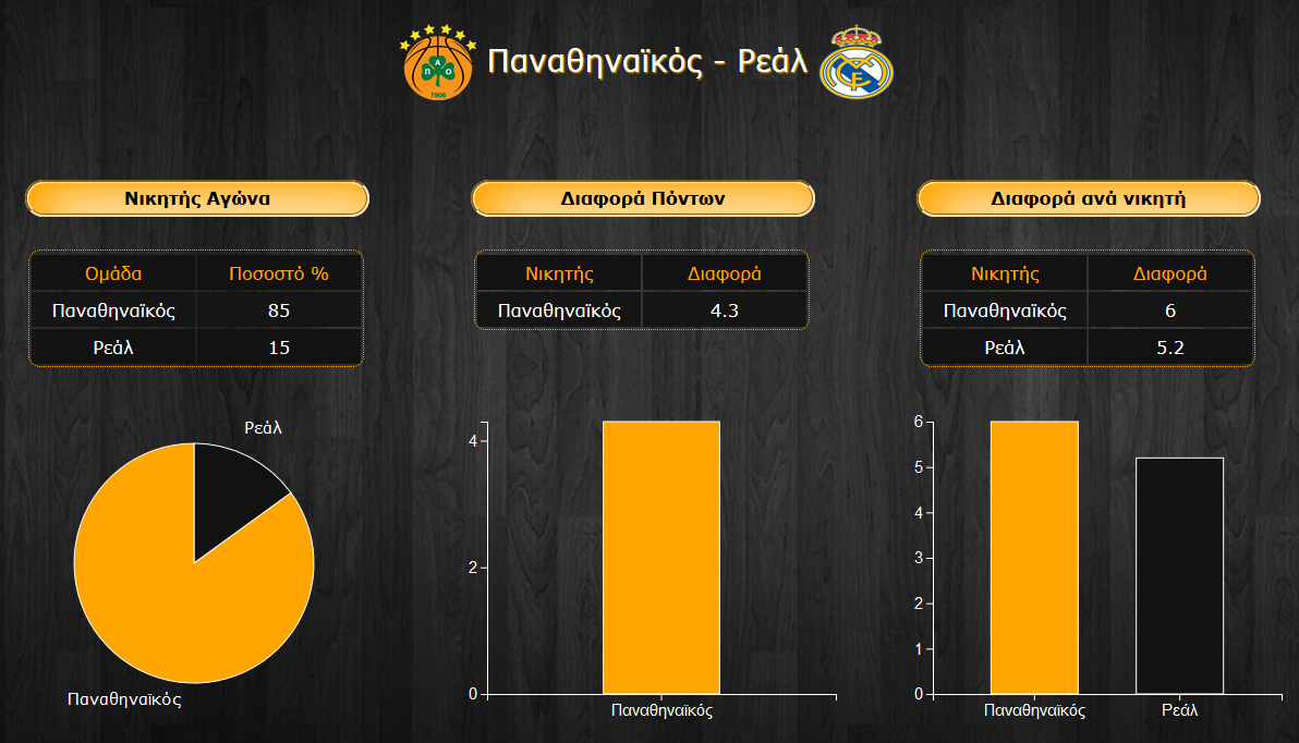 Οι εξαιρετικές πρόσφατες εμφανίσεις του Παναθηναϊκού, αλλά και η ...νοσοκομειακή κατάσταση της Ρεάλ καθιστούν ως μεγάλο φαβορί του αγώνα τους πράσινους, με ποσοστά 85%-15% (σήμερα, Τρίτη βράδυ), σύμφωνα με τις απόψεις των αναγνωστών. Δεδομένης βέβαια και της συνολικής ποιότητας των Μαδριλένων, η διαφορά δεν αναμένεται να ανοίξει και πολύ (βάσει πάντα των προβλέψεων, καθώς, ειδικά τις τελευταίες αγωνιστικές οι 20άρες και οι 30άρες τείνουν να γίνουν ο κανόνας και όχι οι εξαιρέσεις), με τους γηπεδούχους να βρίσκονται στο +6 για δική τους νίκη και τους φιλοξενούμενους στο +5,2 για τη δική τους αντίστοιχα. Συνολικά λοιπόν, η τελική διαφορά διαμορφώνεται στους 4,3 πόντους υπέρ του Παναθηναϊκού, που ακόμα και όταν βρίσκεται σε ρόλο αουτσάιντερ απέναντι στην Ρεάλ τα τελευταία χρόνια, καταφέρνει να της βάζει δύσκολα.