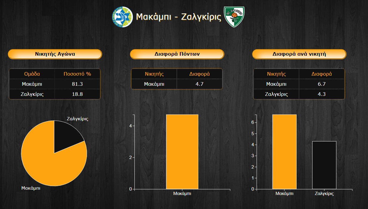 Το φαβορί της αναμέτρησης δεν είναι άλλο από την Μακάμπι, ωστόσο με την Ζαλγκίρις να έχει κάνει ήδη σημαντικές ζημιές και να επιδεικνύει μέχρι και καλύτερο πρόσωπο στα εκτός έδρας ματς, το ποσοστό της για τη νίκη στο ματς ανέρχεται στο 18,8%. Εδώ βέβαια θα πρέπει να σημειώσουμε πως τις δύο πρώτες ώρες της νέας αγωνιστικής του παιχνιδιού, το ζευγάρι αυτό είχε γραφτεί κατά λάθος ανάποδα κι έτσι ίσως έχει παραμείνει ένα μικρό ποσοστό παραπάνω υπέρ της Ζαλγκίρις, το οποίο, στην περίπτωση αυτή, αναμένεται να μειωθεί μέχρι την έναρξη της αγωνιστικής. Οι επιμέρους διαφορές νίκης των δύο ομάδων ανέρχονται στους 6,7 πόντους για την Μακάμπι και στους 4,3 πόντους για τους Λιθουανούς κι έτσι η συνολική διαφορά του αγώνα διαμορφώνεται στους 4,7 πόντους υπέρ των γηπεδούχων.