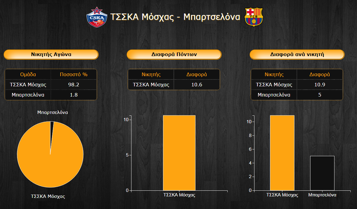 Αναμέτρηση με ξεκάθαρο φαβορί στην Μόσχα, όπου παρά τη δυναμική της Μπαρτσελόνα, το μέγεθος και η ποιότητα της ΤΣΣΚΑ δεν αφήνουν περιθώρια για εκπλήξεις, τουλάχιστον στο κομμάτι των προβλέψεων, από μια κατ' ουσίαν νέα ομάδα. Έτσι, το ποσοστό νίκης της ομάδας του Δημήτρη Ιτούδη ανέρχεται στο 98,2% και μόλις 1,8% ...απομένει στους Καταλανούς. Αυτό το μικρό ποσοστό θεωρεί ότι η Μπαρτσελόνα θα επικρατήσει με μέση διαφορά 5 πόντων ενώ μεγαλύτερο νούμερο συναντάμε για τους γηπεδούχους, που ίσως έχουν πιο εύκολο έργο με 10,9 πόντους να δίνονται υπέρ τους στις αντίστοιχες προβλέψεις. Έτσι, η τελική διαφορά του αγώνα διαμορφώνεται στους 10,6 πόντους υπέρ της ΤΣΣΚΑ, από το σύνολο των ψήφων.