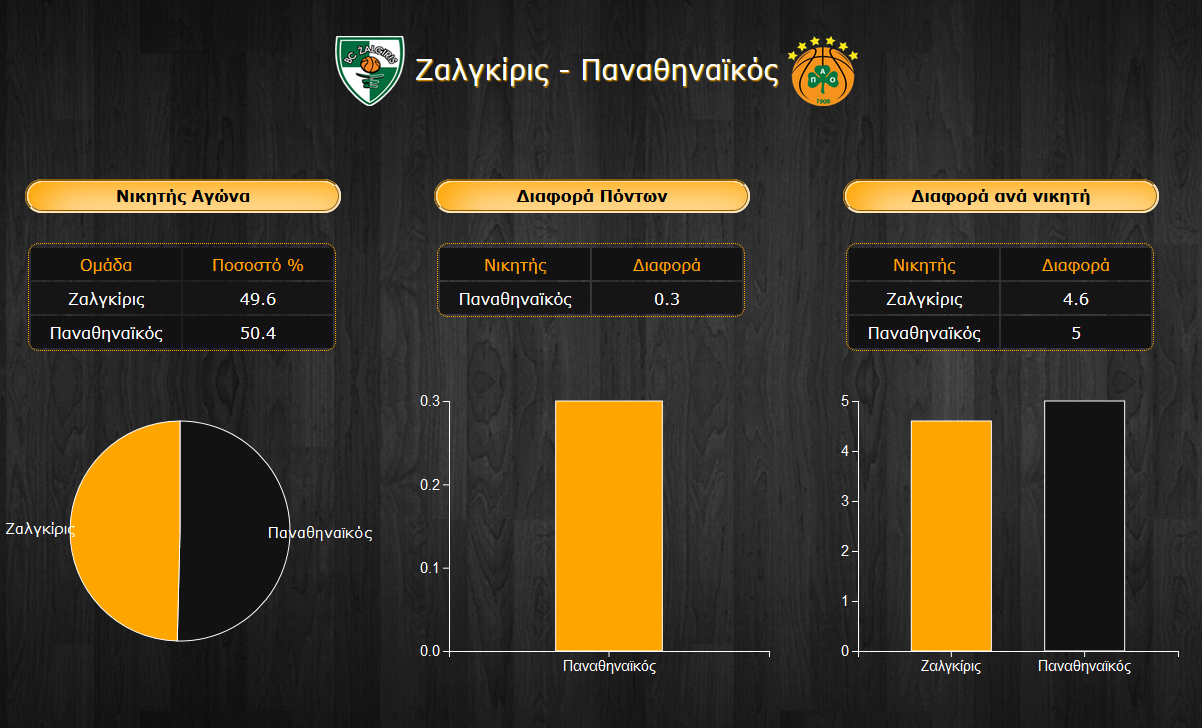 Παρόμοιοι είναι οι αριθμοί που δίνονται και στις επιμέρους διαφορές νίκης από το κοινό, με την πιθανή νίκη του Παναθηναϊκού να υπολογίζεται στους 5 πόντους, ενώ την αντίστοιχη των γηπεδούχων στους 4,6. Περιμένουμε λοιπόν ένα παιχνίδι που όλα είναι ανοιχτά και όπου η ανταγωνιστικότητα των δύο ομάδων μπορεί να το κρατήσει κλειστό μέχρι τέλους. Συνολικά, η διαφορά διαμορφώνεται στους 0,3 πόντους υπέρ του Παναθηναϊκού.