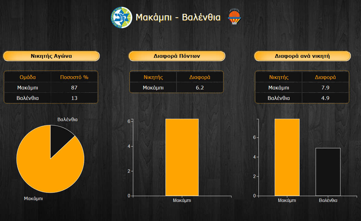 Διαφορετικά, είναι λογικό να δούμε νίκη της Μακάμπι με διαφορές της τάξης των 7,9 πόντων, όπως διαμορφώνεται η επιμέρους διαφορά νίκης αυτή τη στιγμή και πάνω. Αντιθέτως, ενδεχόμενο διπλό της ισπανικής ομάδας αναμένεται να έρθει με πιο δύσκολο τρόπο, με μέση διαφορά τους 4,9 πόντους. Έτσι, από το σύνολο των ψήφων προκύπτει η διαφορά των 6,2 πόντων υπέρ των γηπεδούχων.