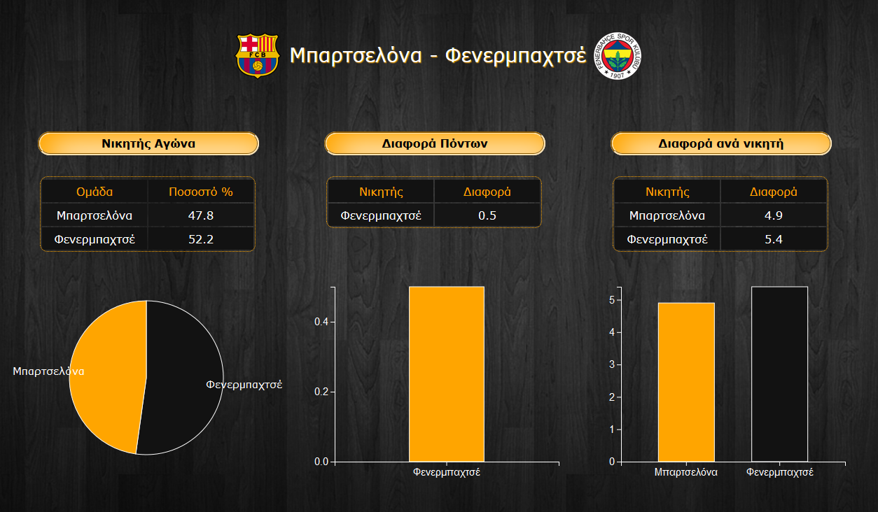 Σπουδαίο ντέρμπι αναμένεται στην Βαρκελώνη, ανάμεσα σε δύο ομάδες με πλούσιο υλικό, με τη γηπεδούχο Μπαρτσελόνα να συγκεντρώνει το 47,8% των προτιμήσεων του κοινού, έχοντας κάνει μερικές μεγάλες "ζημιές" στο γήπεδο αυτό και την πρωταθλήτρια Φενέρ να παραμένει έστω και οριακά το φαβορί του ματς με ποσοστό 52,2%. Ντέρμπι δείχνουν και οι επιμέρους διαφορές νίκης των δύο ομάδων, τόσο ως προς το μέγεθός τους, όσο και ως προς τη μικρή μεταξύ τους απόκλιση.