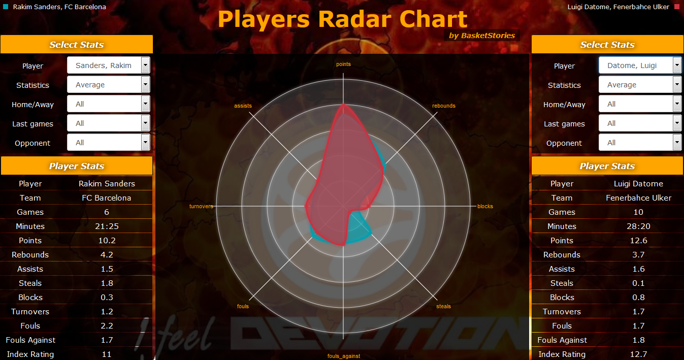 Ο Luigi Datome από την άλλη είναι αναμφίβολα ένας από τους κορυφαίους επιθετικούς εκφραστές της Φενερμπαχτσέ. Ο Ιταλός φόργουορντ σε 7 περισσότερα λεπτά σκοράρει 12,6 πόντους, μαζεύει 3,7 ριμπάουντ και μοιράζει 1,6 ασίστ. Η υπεροχή του Ιταλού είναι ορατή, αλλά ο Αμερικανός γκαρντ/φόργουορντ της Μπαρτσελόνα σε λιγότερο χρόνο προσφέρει εξίσου στην ομάδα του.