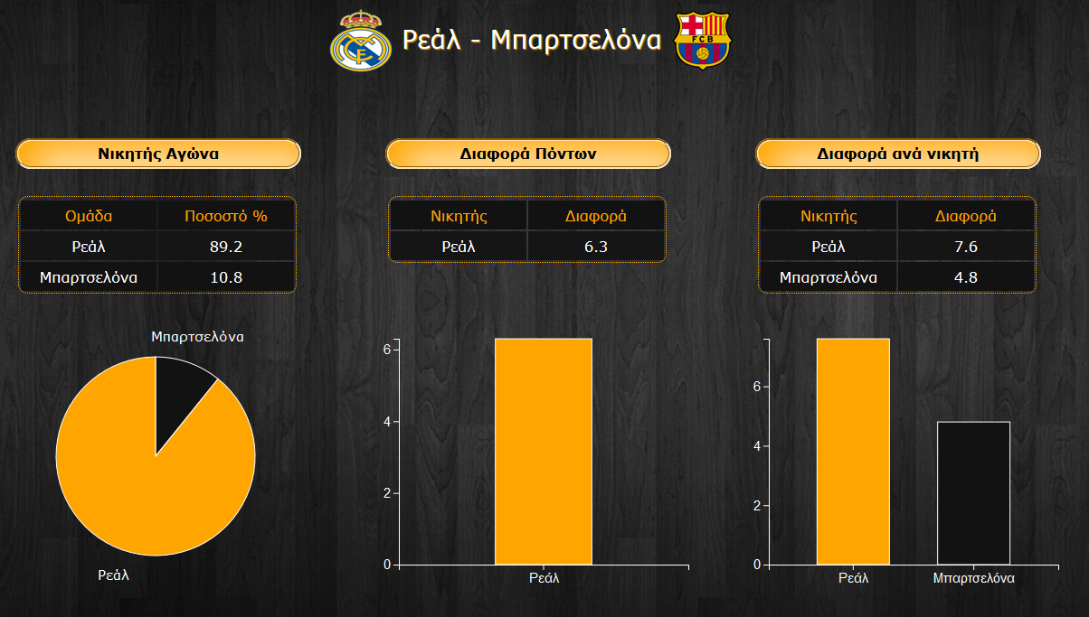 Ξεκάθαρο φαβορί της αναμέτρησης φαίνεται πως είναι η Ρεάλ, βάσει των δικών σας προβλέψεων, αφού συγκεντρώνει ποσοστό 89,2% για τη νίκη στο κλάσικο! Σίγουρα τα προβλήματα τραυματισμών δεν είναι λίγα για τη βασίλισσα, αλλά η επιτακτική ανάγκη για νίκη και η ενθαρρυντική της εμφάνιση απέναντι στον Ολυμπιακό φαίνεται πως υπερισχύουν απέναντι στην Μπαρτσελόνα που ναι μεν βρίσκεται ακόμα πιο χαμηλά στη βαθμολογία, αλλά κάτι τέτοιο είναι έως ένα βαθμό και αναμενόμενο, ως μια εντελώς καινούρια ομάδα. Σίγουρα πάντως το διψήφιο ποσοστό, έστω και οριακό, που συγκεντρώνουν οι Καταλανοί δείχνει ότι έχουν βάσιμες βλέψεις για το παιχνίδι.