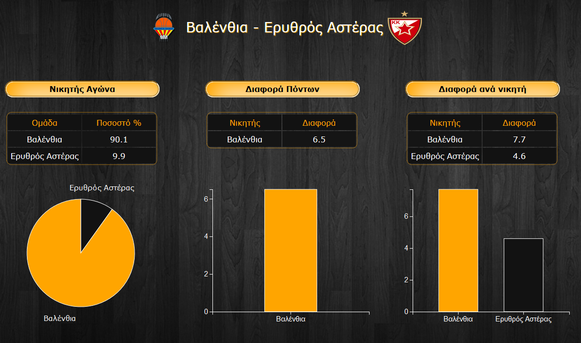 Αν αυτή όντως έρθει, τότε θα προκύψει μέσα από ένα κλειστό παιχνίδι όπου ο Αστέρας θα επικρατήσει με μέση διαφορά 4,6 πόντων, βάσει των προβλέψεών σας. Από την άλλη, η ισχύς της έδρας αναμένεται να δώσει έξτρα ώθηση στην Βαλένθια, με την ενδεχόμενη νίκη της να ανέρχεται στους 7,7 πόντους. Έτσι, η τελική διαφορά του αγώνα διαμορφώνεται στους 6,5 πόντους για τους γηπεδούχους.