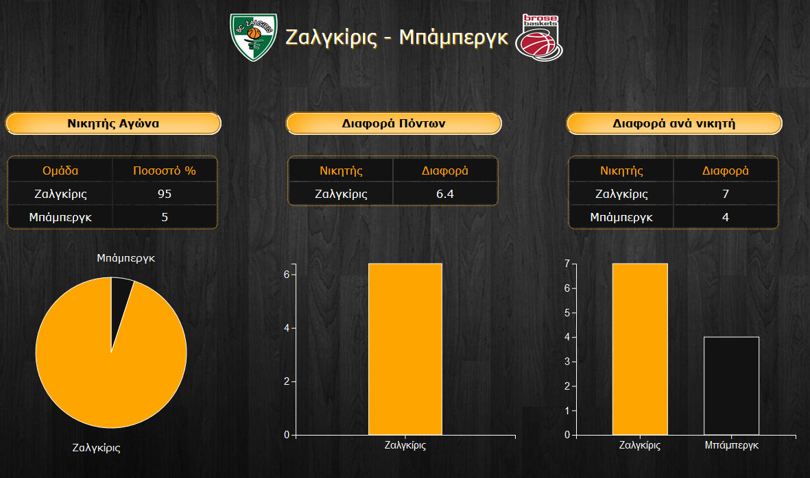 Η πολύ μεγάλη νίκη της Ζαλγκίρις μέσα στην Φενερμπαχτσέ φαίνεται πως της δίνει άλλον αέρα, όπως φαίνεται κι από το 95% που συγκεντρώνει στην "παράσταση νίκης" για τον αγώνα με την Μπάμπεργκ. Οι Γερμανοί πάντως έχουν αποδειχθεί ιδιαίτερα αποτελεσματικοί φέτος και έστω και με το 5%, δείχνουν ότι θα παλέψουν και με το παραπάνω το ματς με μια ομάδα που απέχει μία νίκη στη βαθμολογία.