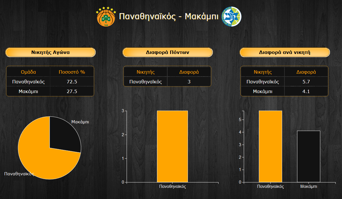 Οι πρωταθλητές Ελλάδας σκοράρουν 78,7 πόντους κατά μέσο όρο, λίγο πίσω από τους 80 της Μακάμπι, ενώ παράλληλα δέχονται 77,2 πόντους κατά μέσο όρο, έναντι 80,2 της Μακάμπι. Οι πράσινοι σουτάρουν πολύ καλύτερα από τη γραμμή του τριπόντου με 40,9% έναντι του αισθητά χαμηλότερου 33% της Μακάμπι η οποία παίζει εντελώς αντίθετα με το στυλ του Παναθηναϊκού.