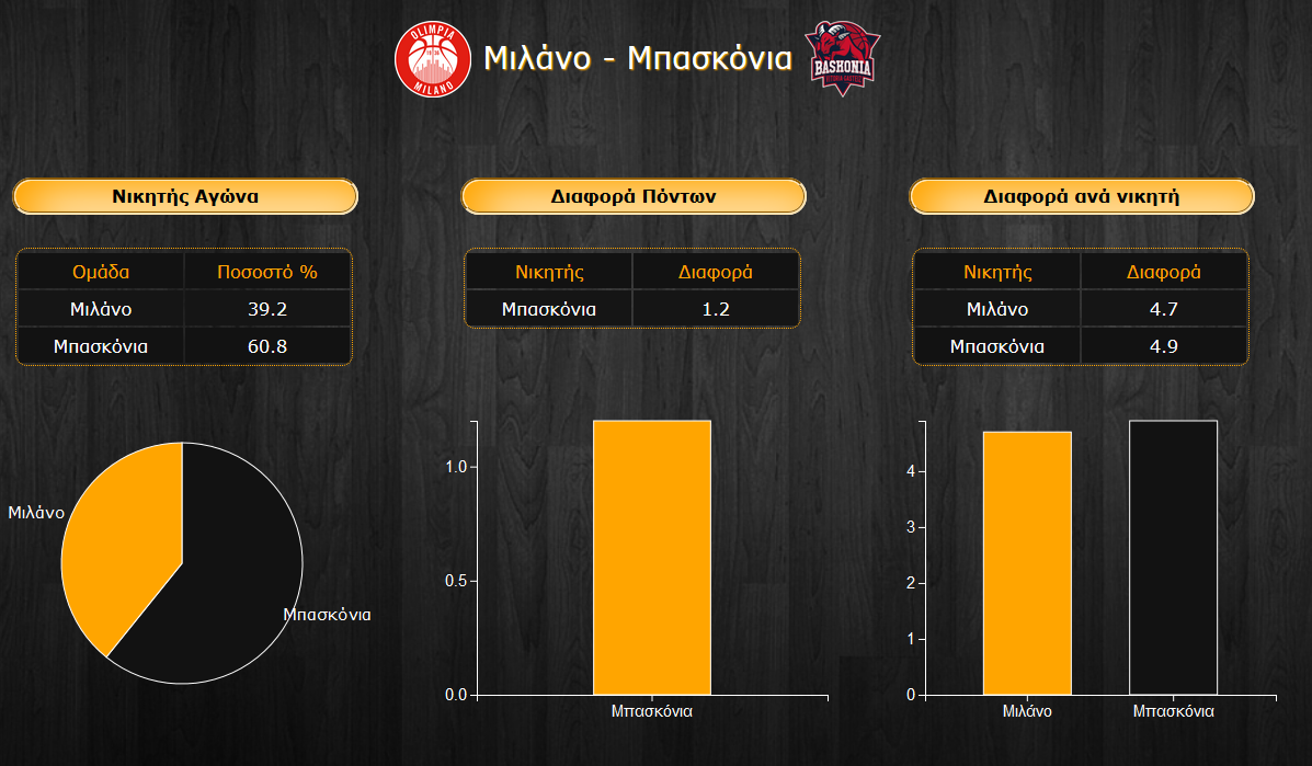 Οι Βάσκοι σουτάρουν με πολύ μεγαλύτερη αποτελεσματικότητα. Οι παίκτες της ομάδας του Martinez έχουν 55,1% στα δίποντα (έναντι 50,1% των Ιταλών) και 39,7% από τη γραμμή των 6,75μ. έναντι 35,15 της Αρμάνι. Οι Ιταλοί θα πρέπει να βρουν τις λύσεις απέναντι σε μια επίθεση που πετάει φωτιές ωστόσο οι αμυντικοί τους δείκτες στα παιχνίδια της Ευρωλίγκας δεν αφήνουν πολλά περιθώρια αισιοδοξίας για να αναχαιτίσουν την Μπασκόνια.