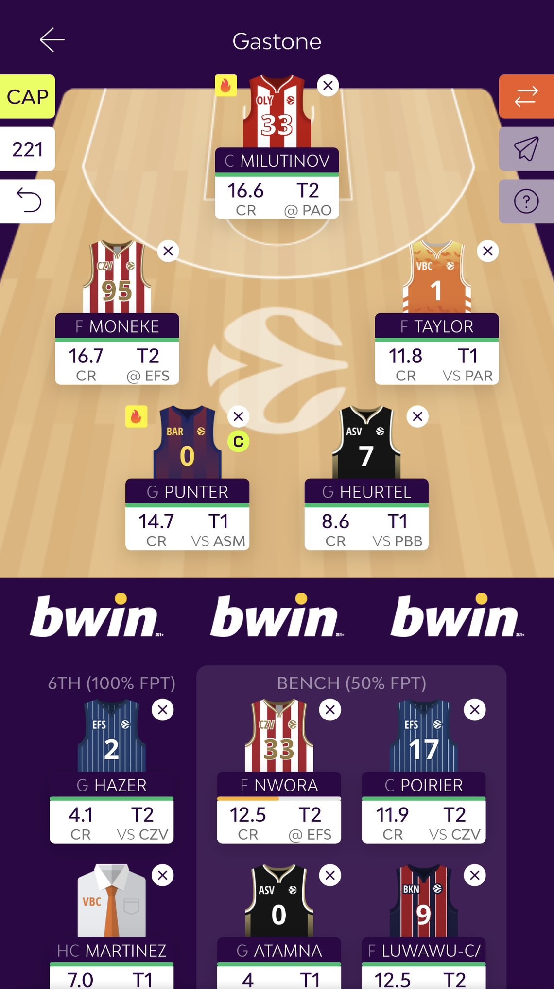 Επιγραμματικά η παρουσίαση της ομάδας του Gastone για τη 18η αγωνιστική του Euroleague Fantasy, χωρίς την καθιερωμένη ανάλυση.