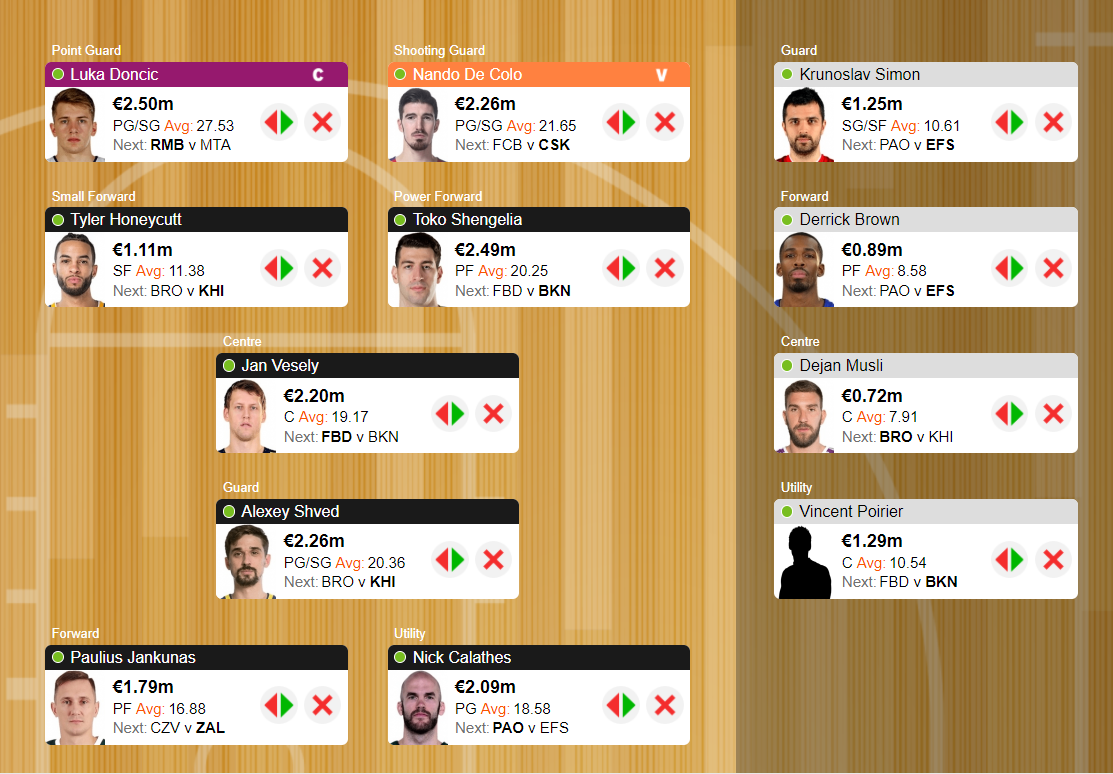 Αρχικά λοιπόν, δεν έχω σκοπό να πραγματοποιήσω κάποια αλλαγή στους "σταρ" της ομάδας, δηλαδή Doncic, De Colo και Shved, παρά το γεγονός ότι οι δύο τελευταίοι είναι υπερτιμημένοι και κινδυνεύουν να χάσουν κι άλλο σε αξία. Ήδη έχουν χάσει αρκετά όμως και βάσει ...πιθανοτήτων, θα πρέπει να επανέρθουν άμεσα στα μεγάλα σκορ. Εξάλλου, όπως έχει αναφερθεί πολλές φορές τόσο από τη στήλη, όσο και από τις υπόλοιπες φαντασιακές αναλύσεις του BasketStories, οι όποιες οικονομικές ζημιές μπορούν να καλυφθούν από την απόκτηση και παρουσία υποτιμημένων παικτών στον πάγκο της ομάδας.