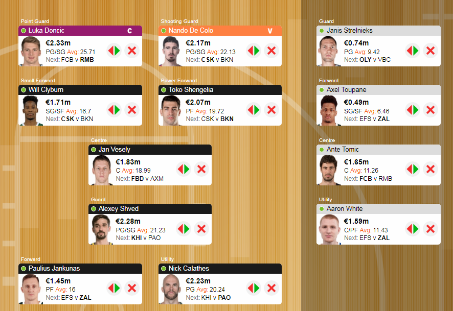 Janis Strelnieks του Ολυμπιακού, παρά να αγοράσω ένα πιο ακριβό όνομα, για κάλυψη του Shved. Ο Λετονός αρχίζει να βρίσκει ξανά τα πατήματά του και αποδίδει στα τελευταία ματς και σε συνδυασμό με το βαθμό της υποτίμησής του, μπορεί να προσφέρει αρκετά ευρώ τις δύο επόμενες εβδομάδες. Ούτως ή άλλως το παιχνίδι με τη Βαλένθια κάθε άλλο παρά απαγορευτικό είναι για ένα αξιόλογο σκορ, από τη στιγμή μάλιστα που οι Ισπανοί έχουν ουκ ολίγα προβλήματα τραυματισμών στην περιφέρεια.