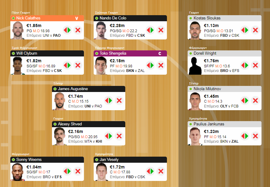 Αρχηγός αυτή την εβδομάδα προορίζεται να είναι ο Toko Shengelia, λόγω ποιότητας, έδρας και υψηλότατου κινήτρου για το ματς με την Ζαλγκίρις. Ο Γεωργιανός τα είχε πάει περίφημα και στο παιχνίδι του πρώτου γύρου, ενώ φαίνεται πως δεν υπάρχει κάποιος άλλος ισχυρός ανταγωνιστής ως προφανής επιλογή αρχηγού. Το θέμα είναι ότι ο παίκτης της Μπασκόνια δεν αγωνίστηκε το σ/κ στην ACB, λόγω κόπωσης, επομένως υπάρχει και στη δική του περίπτωση αστερίσκος. Αν δεν αγωνιστεί βέβαια υπάρχει η κάλυψη, αλλά όπως και να 'χει, καλό είναι να γνωρίζουμε, στο βαθμό που είναι δυνατό τις ...προδιαγραφές της συμμετοχής του στο ντέρμπι με την Ζαλγκίρις. Έτσι και αυτή η επιλογή επιδέχεται αλλαγών. Στο βασικό σενάριο πάντως, υπαρχηγός θα είναι με λίγο ρίσκο ο Νικ Καλάθης, που προτιμήθηκε οριακά του Alexey Shved, ενώ και εδώ μπορεί να υπάρξει αλλαγή ...λογικής, μέσα στις λίγες ώρες που απομένουν για την προθεσμία.