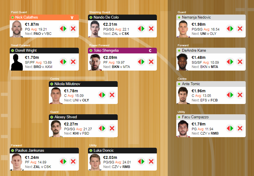 Στις υπόλοιπες επιλογές της ομάδας, ο Wright έδωσε το τίμιο, για τα δεδομένα της αγωνιστικής 11 με τη Μάλαγα, ενώ το ρίσκο με Doncic είχε και αυτό ...μέτρια αποτελέσματα, με τον Σλοβένο όντως να αγωνίζεται απέναντι στην Ζαλγκίρις (ούτως ή άλλως είχε "καλυφθεί" μέσω Campazzo, σενάριο που πιθανώς να ήταν και καλύτερο), αλλά να μένει στο 14,3 σκορ. Στη θέση του θα μπορούσε να είναι τόσο ο Tomic (DNP) ή ο Vesely (8,8), όσο και ο Nedovic (22), άρα ...ούτε ζέστη, ούτε κρύο εδώ.