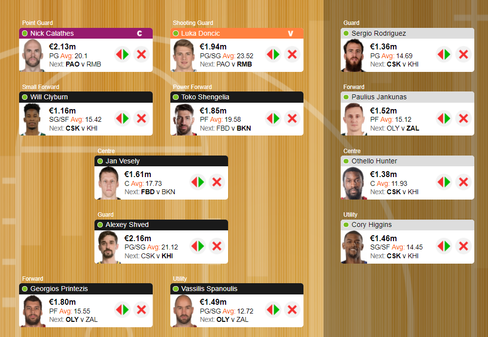 Ας ξεκινήσουμε από τις θέσεις των forwards. Η αλήθεια είναι παρ' όλη την ...έμπρακτη, όλη τη χρονιά, εκτίμησή μου στον Jankunas, δεν βλέπω το λόγο να τον προτιμήσω στο ΣΕΦ, όταν έχω ήδη προτιμήσει τον πιο ανέτοιμο (σε σχέση με αύριο) Πρίντεζη, αλλά και με τον Higgins να παίζει εντός έδρας σε ματς 90 πόντων, χωρίς De Colo. Οπότε το δίλημμα εδώ τίθεται μεταξύ των δύο τελευταίων, μιας και ο Clyburn, έχοντας αποδώσει στην πρώτη αγωνιστική, παραμένει στο ρόστερ και για λόγους ...De Colo, αλλά και Hines.