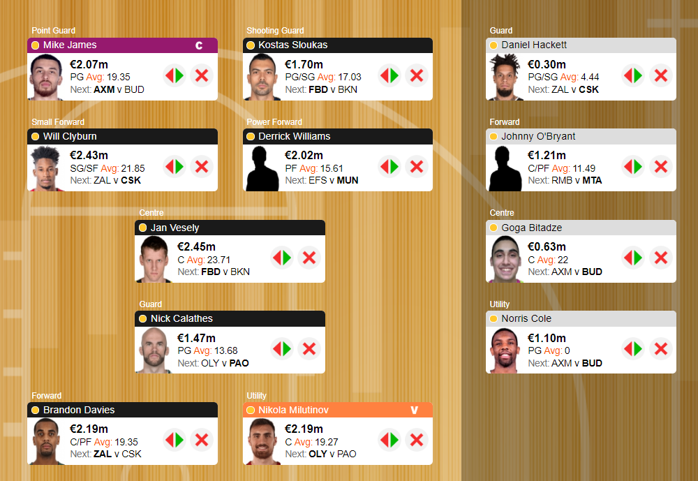Αυτή η τριάδα των κορυφαίων σέντερ του παιχνιδιού αποτελεί και αυτή την εβδομάδα τον -όχι και τόσο- ευχάριστο πονοκέφαλο στο σχεδιασμό της ομάδας. Για να κλείσουμε όμως προηγουμένως τον απολογισμό της αγωνιστικής, Καλάθης και Clyburn έδωσαν δύο μοναδικές παραστάσεις στο ΟΑΚΑ με σκορ 28,6 και 33 αντίστοιχα, ο Williams επανήρθε στα 20άρια κόντρα στην Μπουντούτσνοστ (στηριζόμενος πάντως αρκετά στο σκορ), όπως εξάλλου και ο Mike James μέσα στην Μακάμπι.