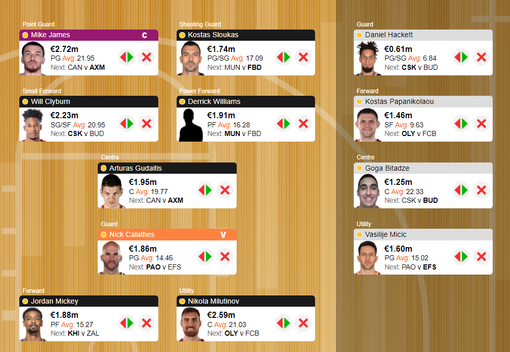 Σκοπεύω να στηριχθώ περισσότερο στην εν γένει σταθερότητα του Gudaitis καθ' όλη τη διάρκεια της χρονιάς και στον πιο υψηλό ρυθμό των Κανάριων, παρά στο γενικά καλύτερο μομέντουμ του Γάλλου σέντερ της Μπασκόνια, λόγω και αντιπάλου, αλλά και όχι αντίστοιχα γεμάτης χρονιάς, σε σχέση με τον Λιθουανό. Δεν έχω κάποια ενημέρωση για αμφίβολη συμμετοχή του σέντερ της Μιλάνο, επομένως, αν δεν υπάρχει κάποιο απρόοπτο που θα αντιστρέψει την επιλογή, θα πορευθώ με αυτόν.