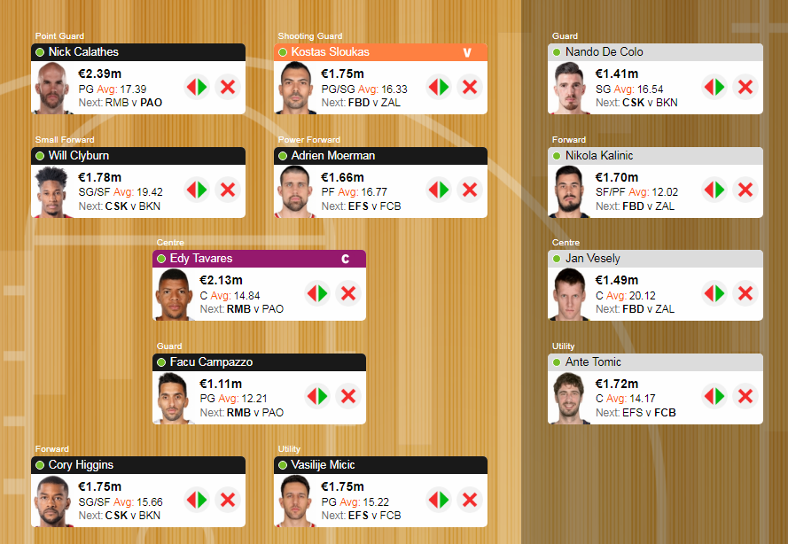 Τέλος, όσον αφορά τον πάγκο, ο Nikola Kalinic θα αντικαταστήσει τον Johannes Voigtmann στη θέση bench forward. Ουσιαστικά προτιμώ να στηρίξω τον Σλούκα από τον φορμαρισμένο Σέρβο, μιας και ο δεύτερος θα μπορούσε έμμεσα να πάρει τη θέση του συμπαίκτη του, εφόσον ο Higgins μεταφερθεί σε θέση SG.