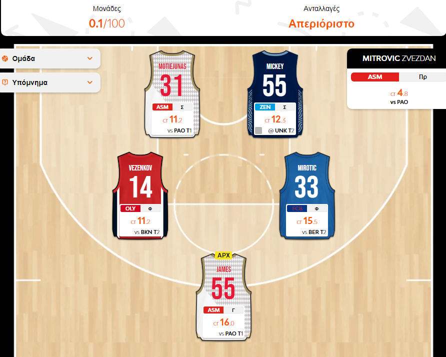 Jordan Mickey που κοστίζει 12,3 credits, μια τιμή σίγουρα όχι φθηνή βέβαια, βάσει του εσωτερικού ανταγωνισμού που έχει να αντιμετωπίσει. Για την ώρα πάντως δείχνει να έχει προσαρμοστεί στο νέο του περιβάλλον και ίσως αυτός να έρχεται πρώτος στην ιεραρχία, αλλά και χρονικά, από τους Gudaitis και Poythress. Το ματς με την Ούνιξ δεν αποτρέπει από ένα θετικό ντεμπούτο, σ' αντίθεση με άλλες πρεμιέρες σέντερ που αναφέρθηκαν, επομένως, ο παίκτης της Ζενίτ πια, θα έρθει να πάρει θέση βασικού στο ρόστερ, σε ένα σχηματισμό 1-2-2.