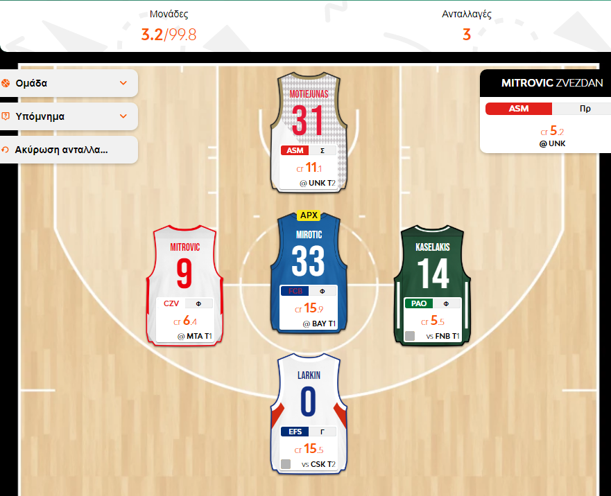 Τέλος, στο θέμα του προπονητή, ο Mitrovic δικαίωσε και με το παραπάνω τις προσδοκίες, με την Ούνιξ στο Καζάν να είναι ο επόμενος αντίπαλος για την Μονακό, παιχνίδι όχι απαγορευτικό, όχι όμως και δεδομένο για ένα νέο θετικό σκορ από τον Μαυροβούνιο. Μεσίνα και Τζόρτζεβιτς είναι ενδιαφέρουσες περιπτώσεις, απλησίαστες όμως για τα οικονομικά της ομάδας. Αυτός που "κουμπώνει" γάντι είναι ο Σφαιρόπουλος της Μακάμπι, με τα κρέντιτς της ομάδας να επαρκούν ακριβώς για την απόκτησή του. Η κίνηση αυτή έχει μπασκετική λογική, αφού η Μακάμπι είναι λογικό να θεωρείται φαβορί στην έδρα της απέναντι στον Ερυθρό Αστέρα. Ωστόσο, με την κίνηση αυτή, το ελεύθερο μπάτζετ της ομάδας μηδενίζει, ενώ στην περίπτωση που μετρούν τα προηγούμενα σκορ παικτών και προπονητών, ο Mitrovic αυτή την στιγμή θεωρείται εμφανώς πιο υποτιμημένος από τον Σφαιρόπουλο, με σκορ 20 και αξία 5,2 κρέντιτς, έναντι σκορ 10 και 8,4 κρέντιτς. Έτσι κι αλλιώς, η Μακάμπι δεν συνηθίζει να παίρνει μεγάλες διαφορές (τουλάχιστον πέρυσι, όπου πολλά ματς έληξαν στον πόντο), ενώ και ο Αστέρας αποδείχθηκε σκληρό καρύδι με την Φενέρ. Μπορώ να πάρω το ρίσκο λοιπόν να παραμείνω με τον Mitrovic, αφήνοντας 3,2 κρέντιτς διαθέσιμα για τις αλλαγές της επόμενης αγωνιστικής, όπου εκτός των άλλων θα ξέρουμε και τι ισχύει με τις μεταβολές τιμών.