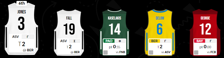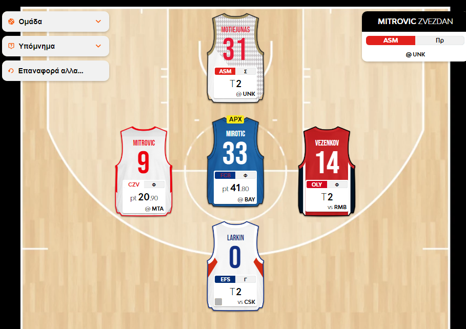 Πράγματι, οι 21 σχεδόν πόντοι μόνο λίγοι δεν είναι και παρότι υπάρχουν παίκτες που έχουν τη δυνατότητα να τους σημειώσουν, δεν μπορώ να το θεωρήσω δεδομένο ότι αυτό θα συμβεί ταυτόχρονα από τους Larkin, Vezenkov, Jones, Fall, Motiejunas. Έτσι, ο Mitrovic κρατάει θέση βασικού, όπως και ο Mirotic φυσικά και μένει να αποφασιστεί ποιος από τους προαναφερθέντες παίκτες θα μείνει εκτός εξάδας και θα προσφέρει μόνο το μισό του σκορ στην ομάδα.